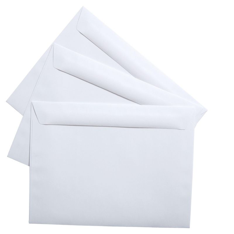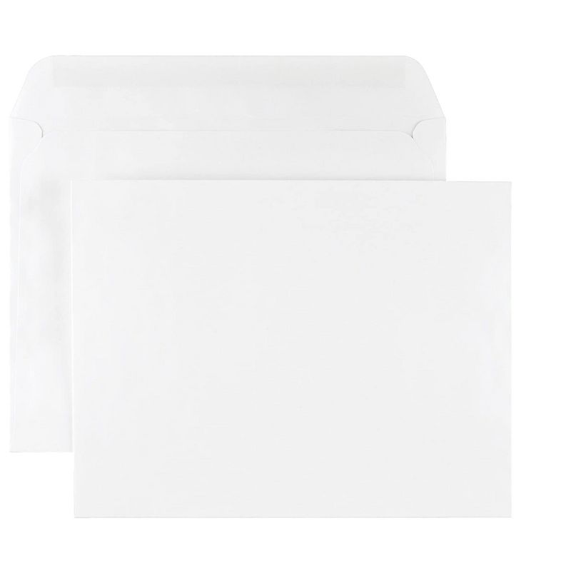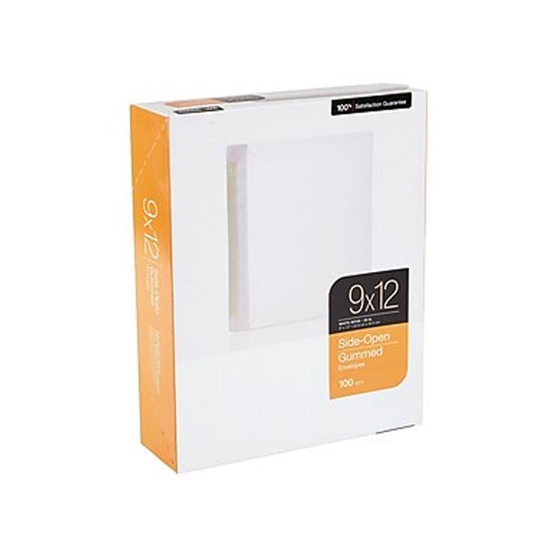 Mail items safely by using this 100-pack of 9 x 12-inch white wove side-opening booklet envelopes. Easily ship items with these booklet envelopes. With a 28-pound paper construction, these envelopes are durable, helping get mail shipped safely, while the side-opening flap is heavily gummed, keeping invoices, reports, and other important documents secure. These booklet envelopes are made with white wove paper material, and the side-opening flap is convenient for inserting and removing large items. Booklet envelopes keep your documents flat in the mail. Envelope size: 9"H x 12"W. Gummed flap closure keeps your documents secured inside the envelope. Envelopes have square flap. Made of white wove paper. 100 envelopes per box. Reduce the hassle, frustration and paper cuts of standard top-opening document envelopes with these side-opening envelopes. These booklet envelopes come in crisp white for a professional appearance and are ideal for document mailing. These envelopes easily accommodate standard-sized documents and are great for business, home or school use. These 9-inch by 12-inch envelopes are ideal for storing and mailing certificates or other documents that should not be folded.Easy Side-Loading Envelopes Save TimeWith the side-opening feature, these envelopes are great for mass mailings or other large-quantity projects. These side-opening envelopes provide more room for your hands when you insert documents, saving time and reducing frustration compared to standard, top-load envelopes.Secure DocumentsThese side-opening envelopes have heavily gummed flaps to provide a strong seal, keeping your documents from sliding out. These solid, 28-pound white wove envelopes provide privacy for your documents and do not have windows. Professional AppearanceThese booklet style envelopes come in crisp white to give a clean, neat appearance. Booklet envelopes keep your documents flat in the mail. Envelope size: 9"H x 12"W. Gummed flap closure keeps your documents secured...