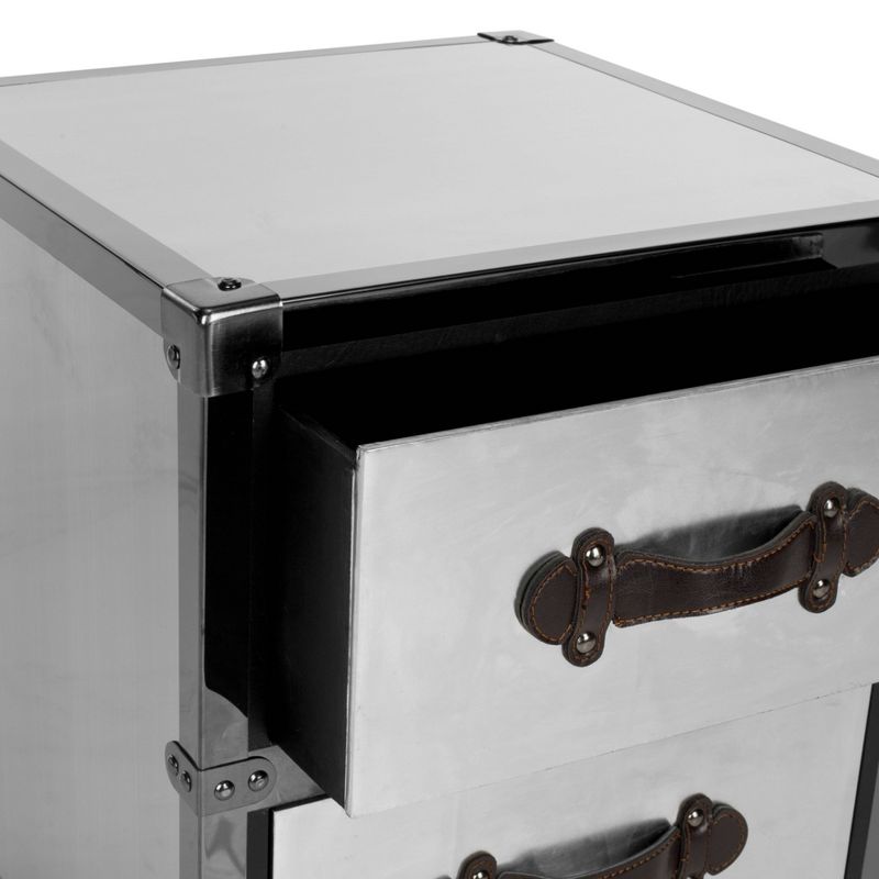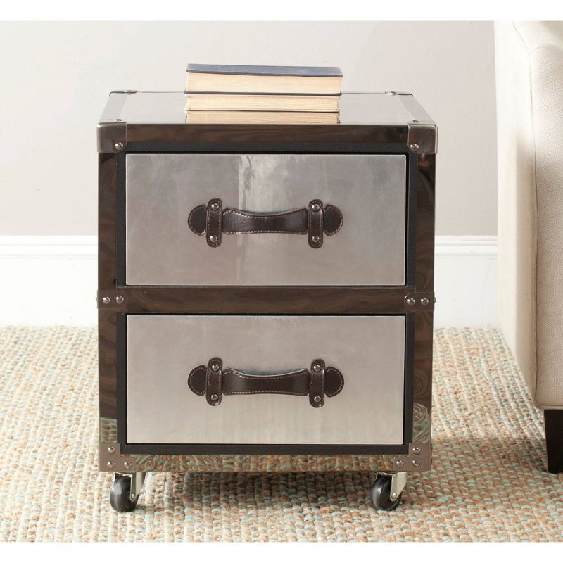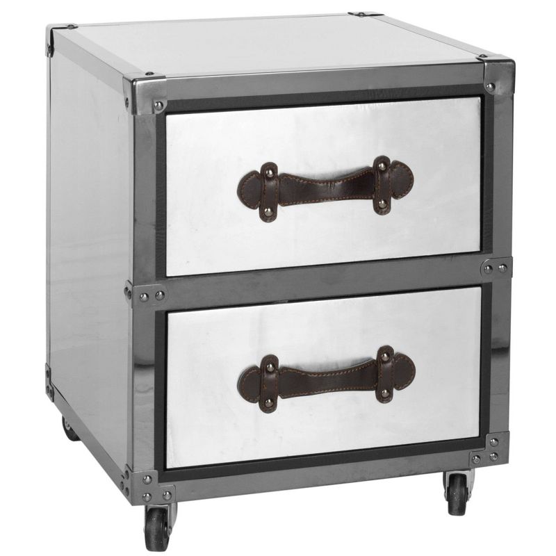 It's the silver lining. The black and silver Mystique Two Drawer Rolling Chest with metal detailing brings just the right amount of industrial charm to the contemporary home office. Inspired by the chic metal cases used to store Hollywood audio visual equipment, its sleek style is bound to be a classic. Crafted from MDF wood and silver iron or stainless steel, this two drawer chest is able to hold up to twenty pounds. The Mystique chest is the perfect choice for Industrial or Transitional style areas.