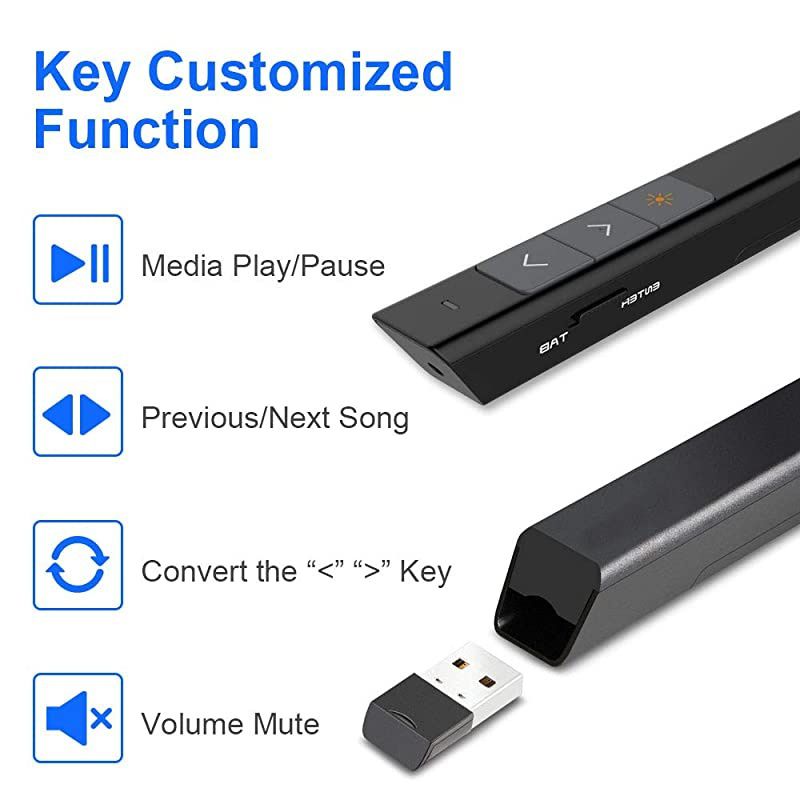 **********Key-customized Presentation PointerPowerpoint remote default setting buttons: On/Off Switch, Page Up/Down, Full/Black Screen. Besides, Powerpoint clicker supports Key-customized function, the buttons can be customized to Media Play/Pause, Previous/Next Track, Volume Mute etc. *****300FT Long Control Range wireless presenter remote is equipped with top-grade microchip to ensure a real 100M/328FT long control distance, Red