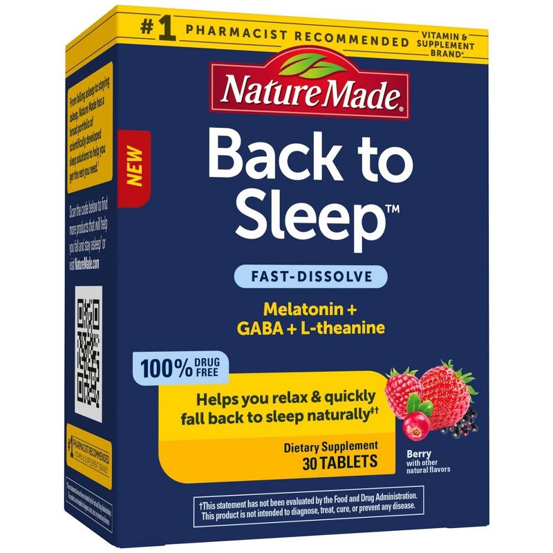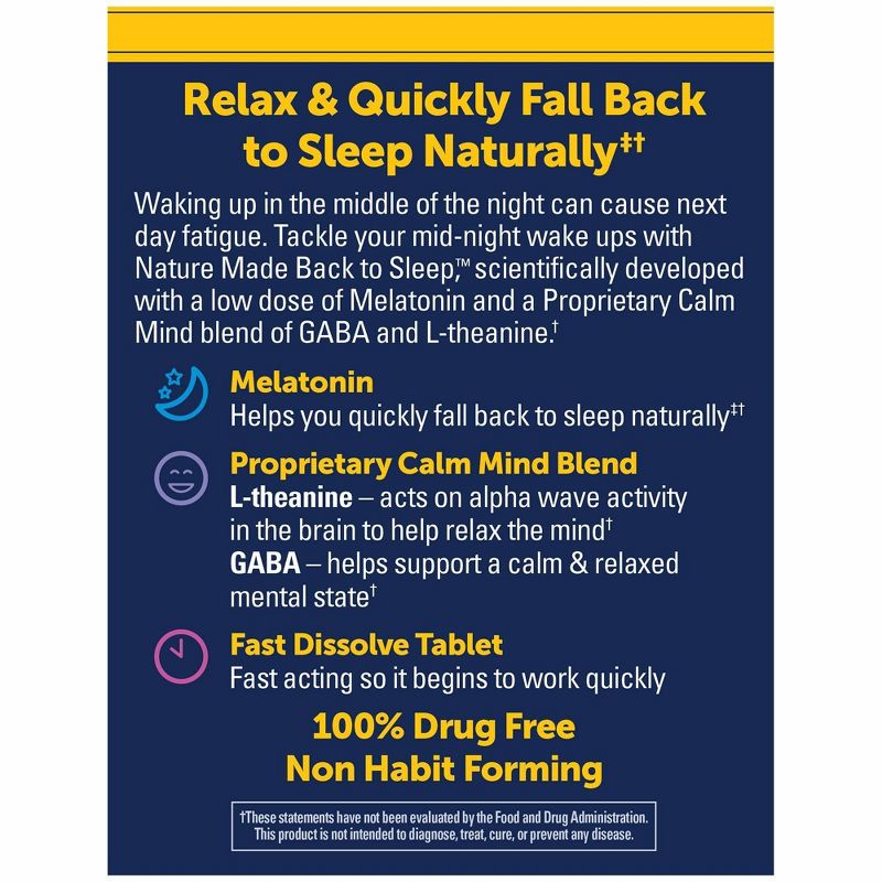 Nature Made Back to Sleep combines Melatonin, L-Theanine, and GABA into one fast-dissolve tablet to help you relax and quickly fall back to sleep.†These Melatonin 1mg fast-dissolve tablets get to work quickly, so you can fall back to sleep naturally.‡†L-Theanine is a naturally occurring amino acid found in green and black tea that acts on alpha brain wave activity to help relax the mind.†GABA acts as a neurotransmitter to help support a calm and relaxed mental state.†These fast dissolve tablets are sugar free and no water is needed.