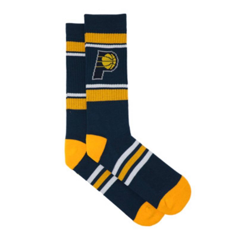 The Indiana Pacers Striped Crew Socks officially Licensed NBA Team Logo Socks are the ultimate fan accessory. Athletic Knit for a classic look, with cartneared arch support and reinforced cushioning in the heel and toe. Made from SweatTECH blended yarns, you'll feel cool and more comfortable in all weather conditions. DualKNIT construction improves durability, giving you years of supporting your favorite team. Size L - IdealFIT sizing for men's shoe sizes 6-12.Size M - IdealFIT sizing Womens Shoe Sizes 3-8 and Youth/Young Man Shoe Sizes 1-6
