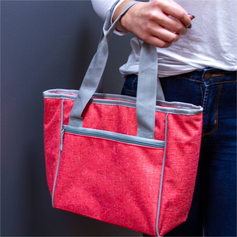 The 16-Can Cooler Tote is made with a heat-sealed, leak-proof lining and can hold sixteen 12 oz. cans plus ice. Designed in a fashion pattern, this cooler features dual shoulder straps for easy carrying and extra storage in a front zippered dry pocket. Holds ice for 24 hours.