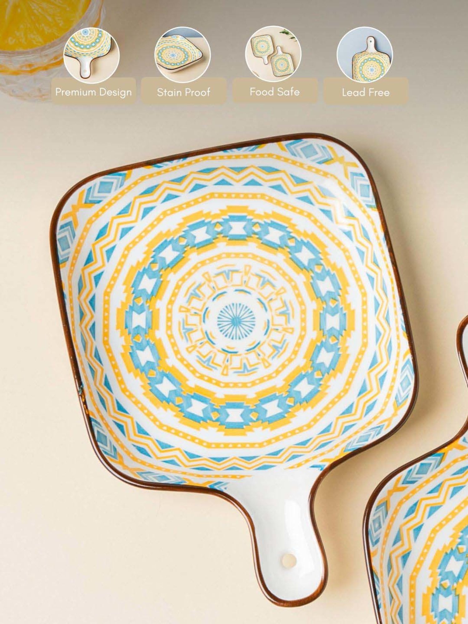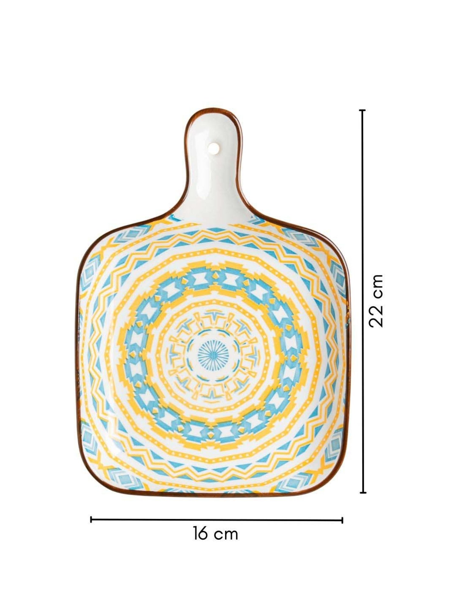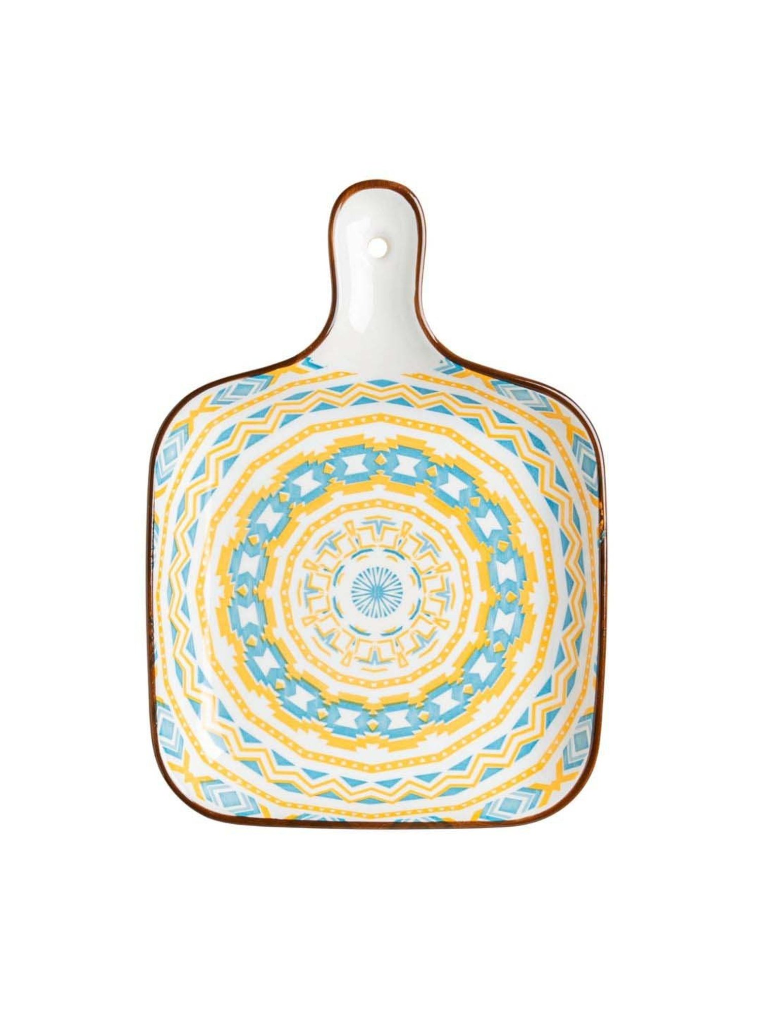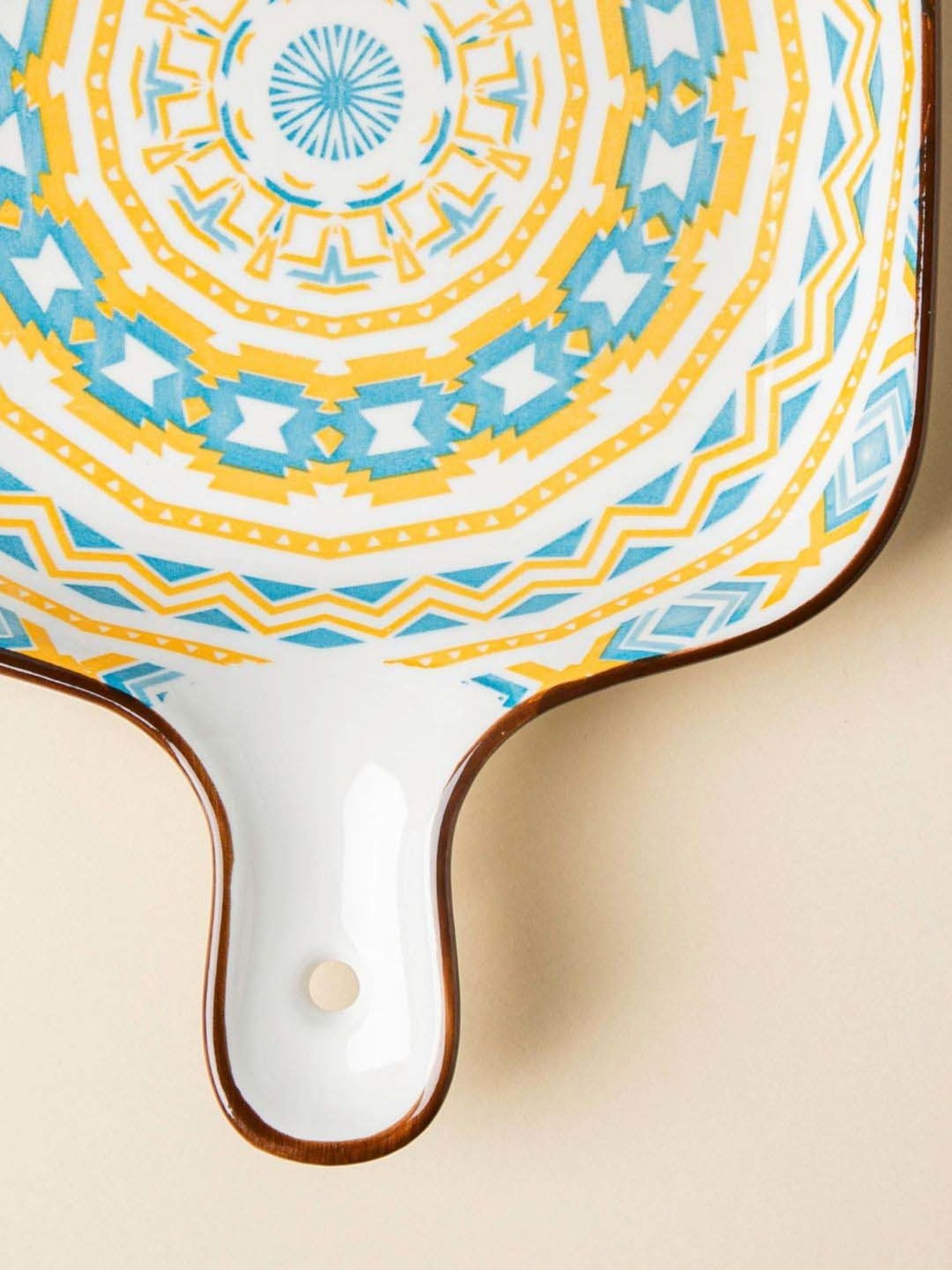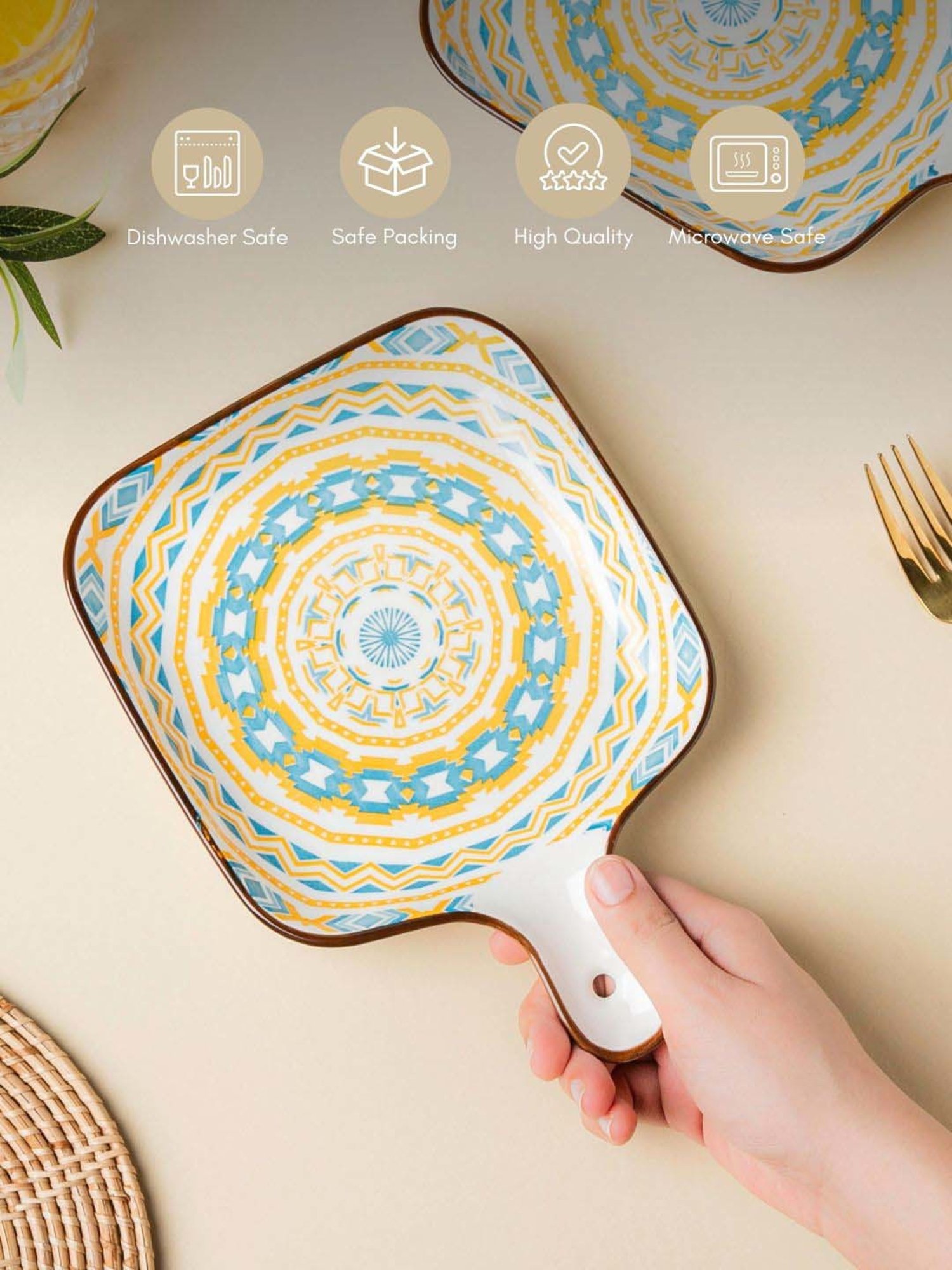 A circumferential harmony of artwork is embossed on the oven-safe, baking plate. On the dining table or console table, wherever it is placed, the patterns on the plate inspire an impression of relaxation and contentment. The ceramic dish with a handle has a balanced and harmonious design. The mandala dish's blend of shades is lively and heartwarming, giving it an eccentric appeal. There are several meals that can be served in the microwave or on oven-safe dishes. Because of the raised sides and brown-colored rim of the dish, it can be used to serve dry snacks as well.