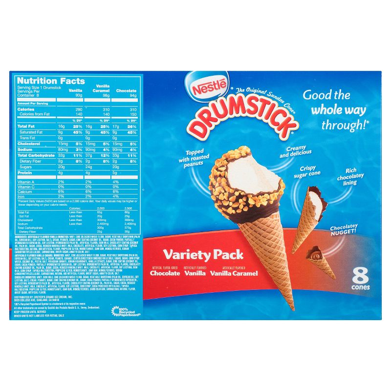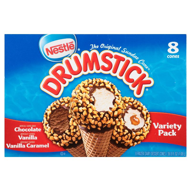 Drumstick Chocolate, Vanilla, Vanilla Caramel Cones Variety Pack features creamy chocolate or vanilla centers in a rich, crunchy, chocolatey dipped coating. Starting with a crispy waffle cone, indulgent chocolatey fudge and caramel centers, crunchy chocolate dipped coating and savory roasted peanuts, the Nestle Drumstick cone creates a snacking experience unlike any other dessert. Plus, this delicious frozen snack is made with no artificial flavors or colors*. Get the classic ice cream flavor you love all in one eating experience with Nestle Drumstick. (*Added colors from natural sources).