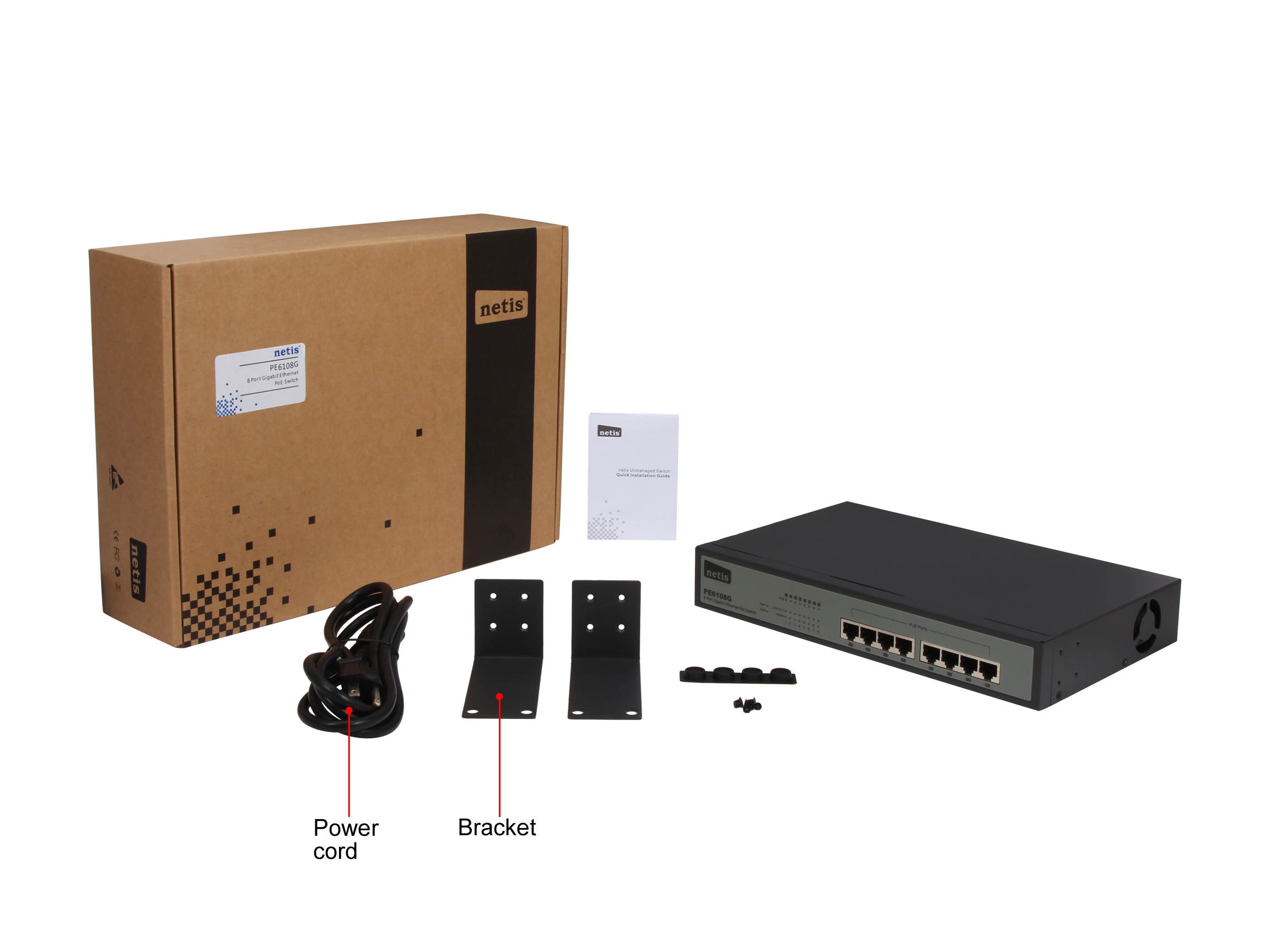 | Package Contents | 1xPE6108G 1xQuick Installation Guide 2xBrackets 1xPower Cord |