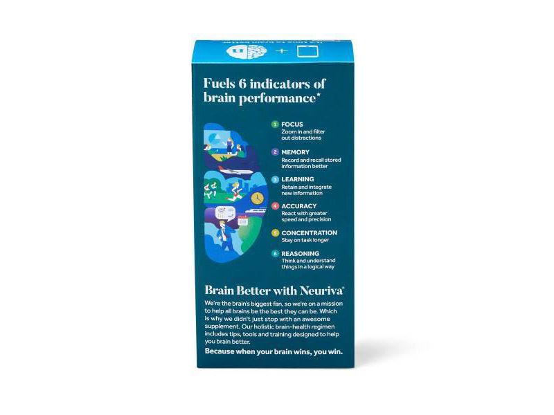 Neuriva Plus is a breakthrough brain performance supplement. The Neuriva team aims to make the world a healthier and brighter place by developing a product that can help you brain better. Neurofactor (the hero ingredient in Neuriva Plus) is an all-natural patented, whole fruit extract of the Coffea Arabica plant and is clinically proven to increase levels of Brain-Derived Neurotrophic Factor (BDNF). More than 6,000 papers have been published on the effects of BDNF since 2014. BDNF is known to strengthen the connections between brain cells.* Phosphatidylserine (PS), the second clinically proven ingredient in Neuriva Plus, is a phospholipid found naturally in the structure of neurons and cell membranes. Plant Sourced Sharp PS (the ingredient used in Neuriva) is clinically proven to aid neuron health and fuel memory & learning.* Neuriva Plus also contains Vitamins B6, B12 and Folic Acid to support brain health & cognitive function.٭ When you take Neuriva Plus, it helps support 6 different indicators of brain performance: focus, memory, learning, accuracy, concentration and reasoning*. *These statements have not been evaluated by the Food and Drug Administration. This product is not intended to diagnose, treat, cure or prevent any disease.