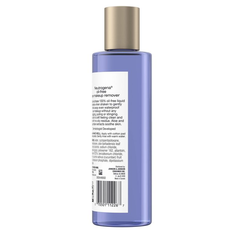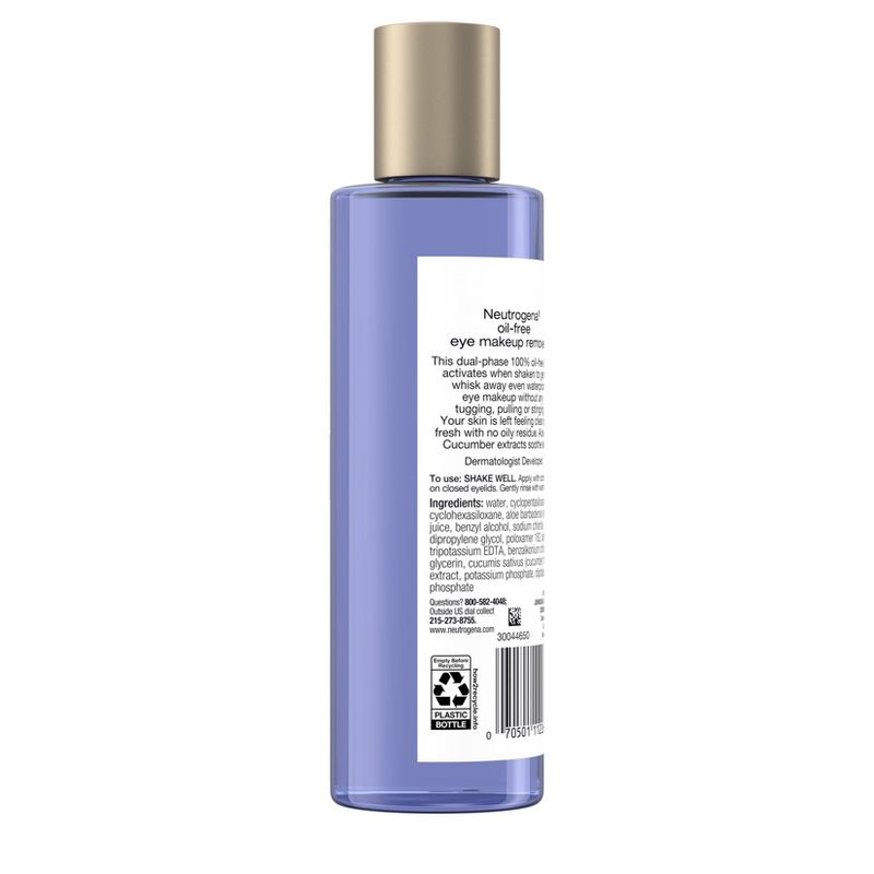 Remove eye makeup in one simple step with Neutrogena Oil-Free Eye Makeup Remover. This dermatologist-developed, dual-phase makeup remover and cleanser formula immediately activates when shaken to gently and effectively remove all eye makeup--even waterproof mascara. This eye makeup remover contains aloe and cucumber extracts to help soothe the skin and work gently without the harsh tugging or pulling. The oil-free, non-greasy liquid makeup remover is ophthalmologist tested, so it's safe for contact lens wearers and those with sensitive eyes. It works quickly and won't leave behind greasy residue.