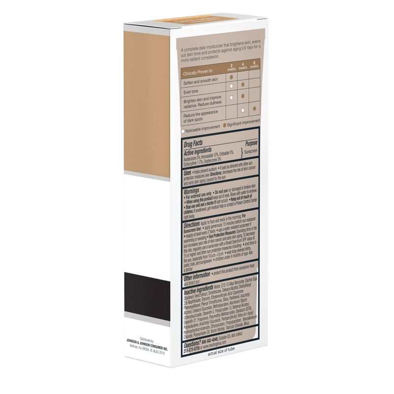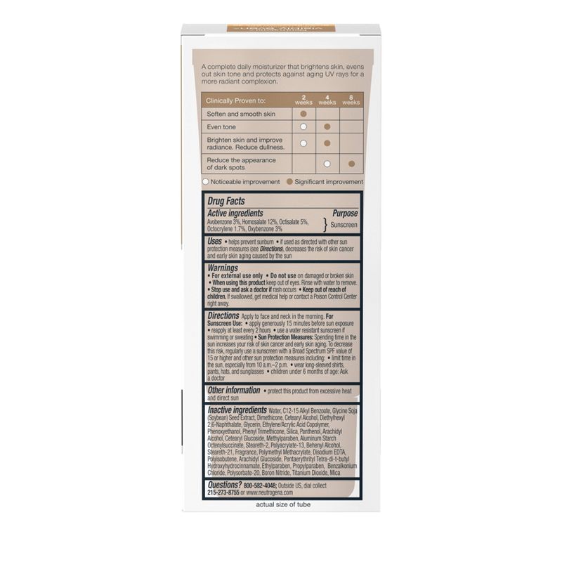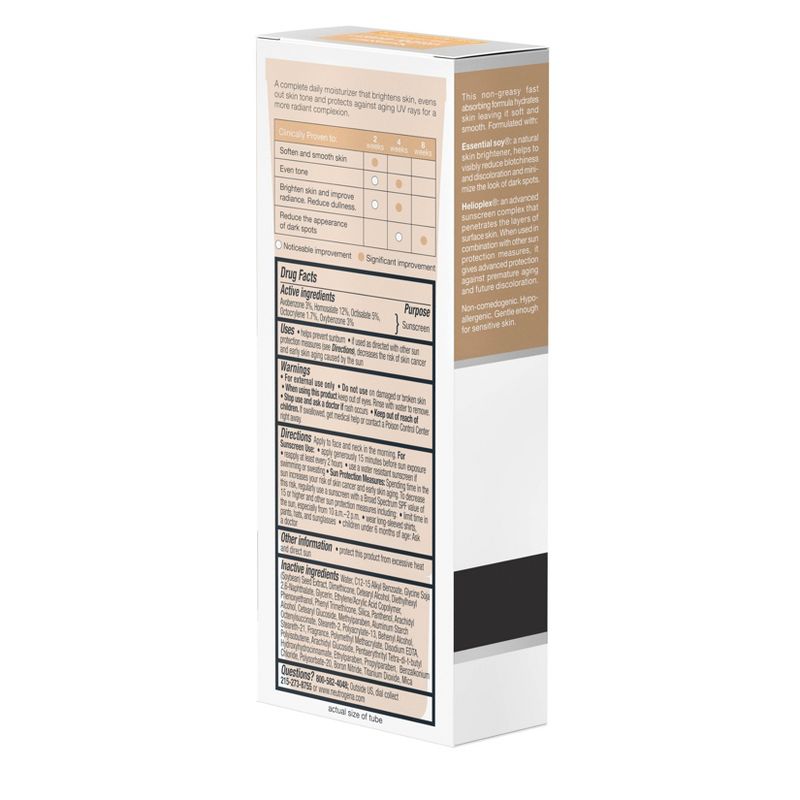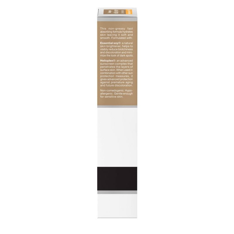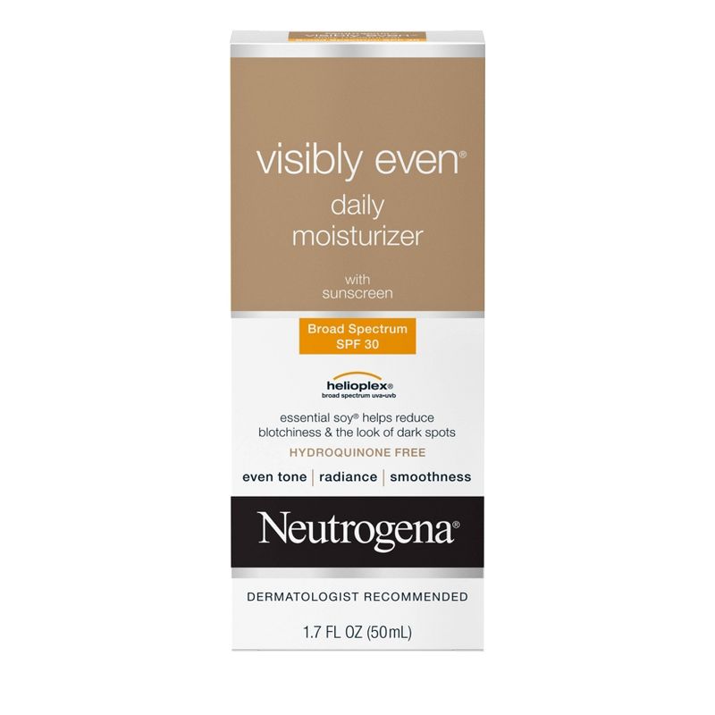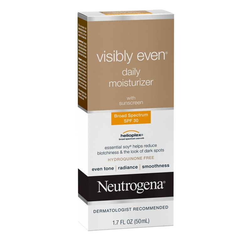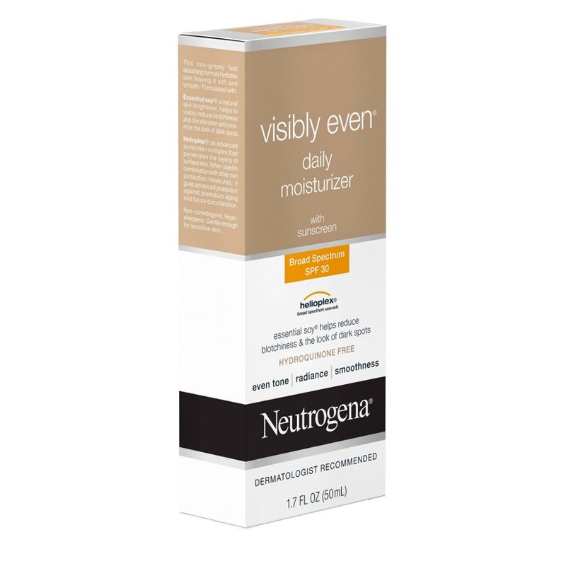 Help improve your skin's radiance with Neutrogena Visibly Even Daily Facial Moisturizer with Broad Spectrum SPF 30 Sunscreen. Gentle on sensitive skin, this complete daily moisturizer helps brighten skin, even tone and protect against aging UV rays for a more radiant complexion. The formula of this face lotion contains Essential Soy, a natural skin brightener, to help visibly reduce blotchiness and discoloration while minimizing the look of dark spots. Also formulated with Helioplex, an advanced sunscreen technology that provides broad spectrum protection against UVA and UVB rays. When used in combination with other sun protection measures, it helps prevent premature signs of aging and future discoloration caused by the sun. This non-greasy, fast-absorbing formula is hypoallergenic and non-comedogenic. Use this moizturizer as part of a daily hydrating skincare routine for an at-home self-care experience.