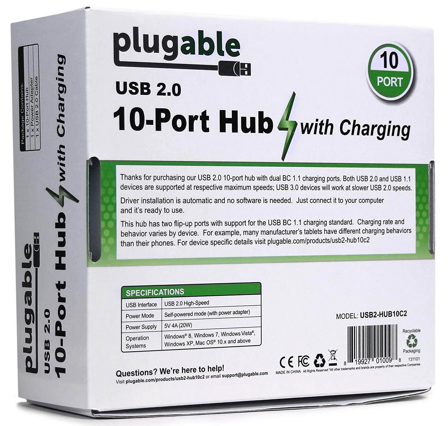 1.EXPANDABLE - With this hub, add up to 10 additional USB devices easily to any USB-capable computer. Never run out of USB ports on your desk again. 2.COMPATIBLE - Compatible with any Windows, Mac, Chrome, Linux or other system with standard USB-A ports. Forward and backwards compatible with all USB 2.0 or 1.1 host controllers and devices. USB 2.0 speeds up to 480 Mbps. Fully plug and play. 3.POWER - Included 5V 4A power supply. Two flip-up ports support independent charging when not connected to a host computer. 4.DESIGN - Master blue power LED. Sleek piano black finish. Six ports in front and four rear ports to minimize cable clutter and maximize accessability. Two of the rear ports flip-up to a vertical position to allow for easy access and insertion of USB flash drives and other devices with one hand. |