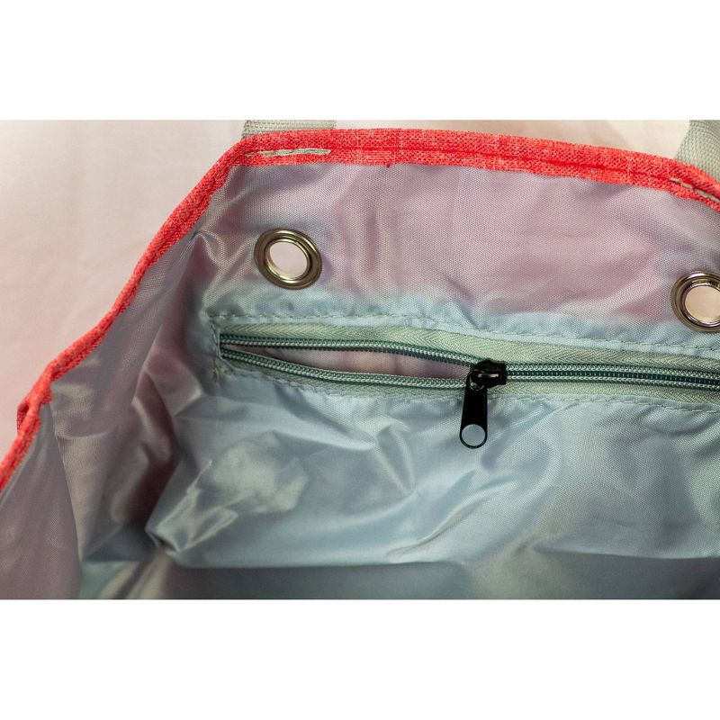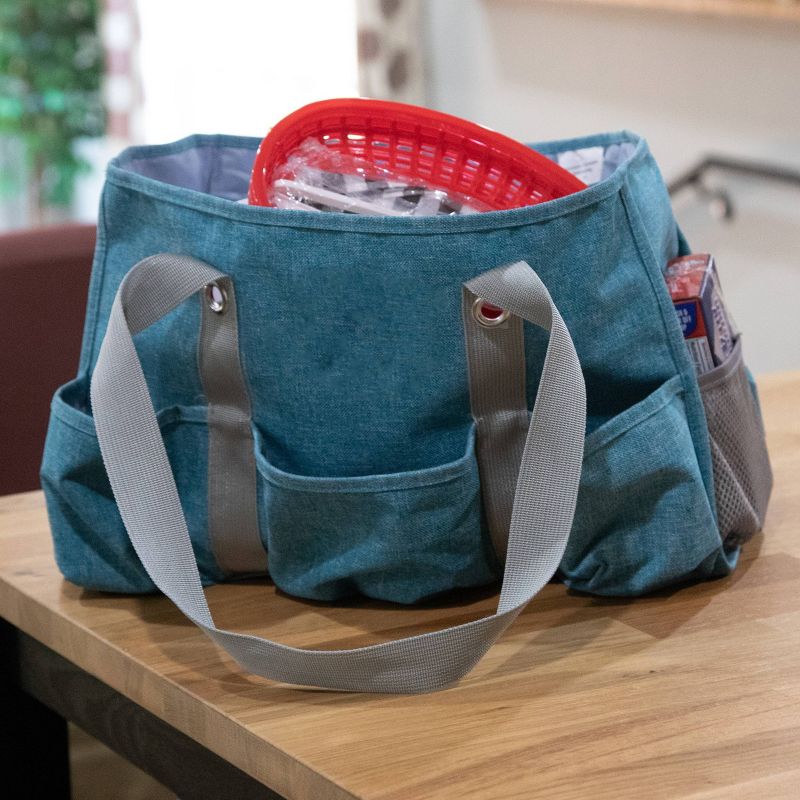 The Junior Caddy tote is the perfect organizing solution. Designed in a fashion pattern with a logo on one side. It offers stylish utility with a large main compartment, five exterior canvas pockets, two exterior mesh pockets and one interior zipper pocket. With so many pockets, the uses for this caddy are endless-- diaper bag, car organizer or tailgate supply tote.