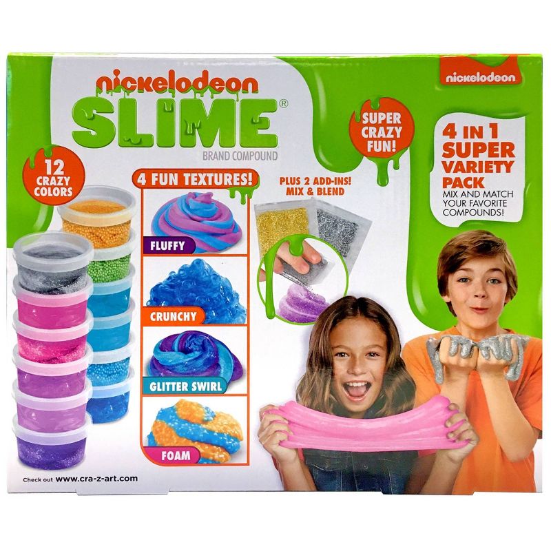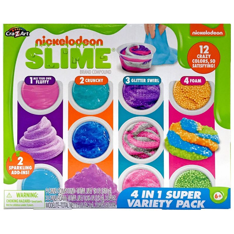 Nickelodeon’s 4 in 1 Super Variety Pack is a super slimy, sensory experience! Includes 4 different textures for you to stretch and blend. Includes Glitter Slime, Crunchy Slime, Fluffy Slime and Floam. Sprinkle in glitter to add sparkle, even blend Modelite clay to create super creamy Fluffy Slime! Enjoy Slime without the mess, it’s all premade! It’s super gooey fun!