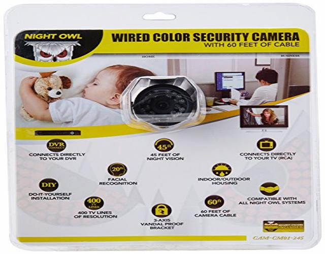 Night Owl’s CAM-CM01-245 is sleek indoor/outdoor night vision camera utilizing a color CMOS sensor to produce 400 TV lines of resolution. The camera produces clear and crisp images throughout the day and the 24 powerful LEDs produce a night vision image up to 45 feet away in complete darkness. The camera comes packed with 60 feet of video/power cable, power adapter and BNC to RCA adapter for easy connection to any TV (RCA) and/or Night Owl DVR (BNC). Night vision up to 45'. Compatible with all Night Owl Systems. Vandal proof 3-axis bracket.
