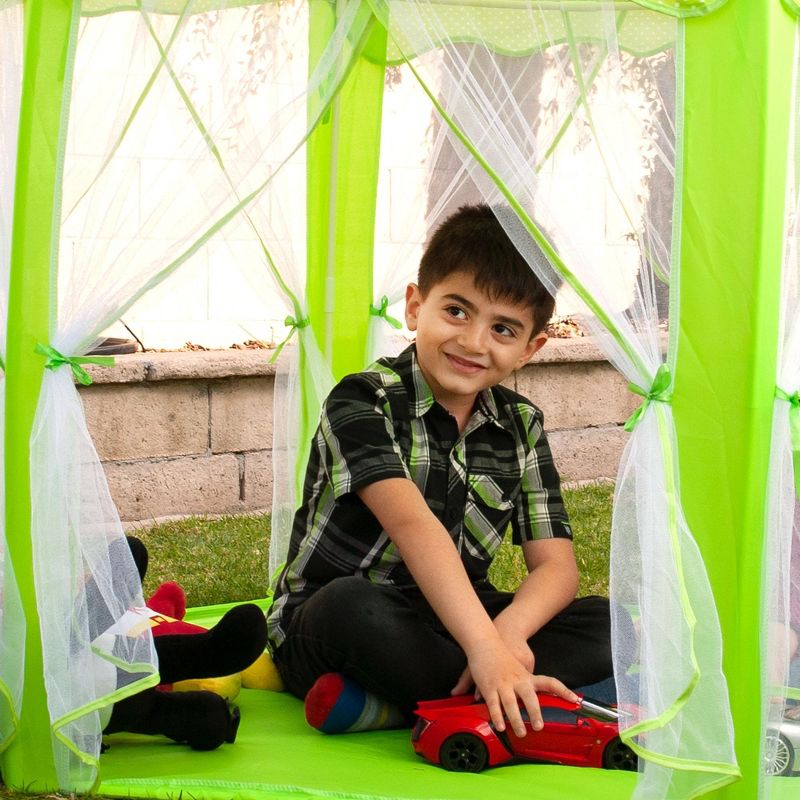 Your little prince and princess will have hours of creative fun with this hexagon fantasy castle play tent! Kids can play all day in this portable play tent indoors or out. Fast and easy set up/breakdown with no tools required. Zippered carrying bag included for convenient storage.