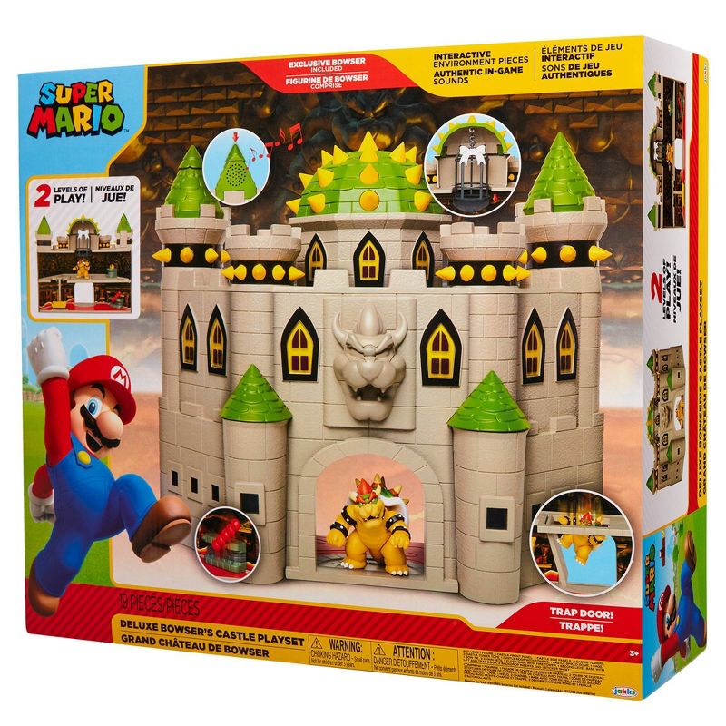 The Deluxe Bowser's Castle Playset lets you explore this classic level from the Super Mario video games. Included in this playset are an exclusive two and a half inch Bowser figure, interactive environment pieces with feature mechanisms, and authentic in-game sounds. You can move the lift up and down, spin the fireballs, open the bottom of the cage, and defeat Bowser by triggering the trap door to drop him into the lava below! Activate the in-game sounds and music by pressing down on one of the castle's spires. This playset works with most two and a half inch figures.