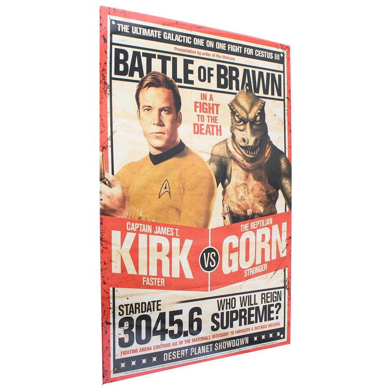 • COOL DESIGN: Tin sign features a fun mock-up poster advertising Captain James T. Kirk's (Faster!) upcoming fight with the Reptilian Gorn (Stronger!).