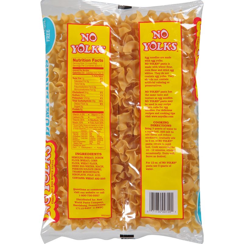 No matter what meal you're trying to whip up, let the No Yolks Pasta Dumplings be an easy, guilt-free base. These egg noodles are made with egg whites only, meaning they have no cholesterol and are low in fat and sodium, so you'll enjoy each delicious bite. Whatever your sauce of choice, grab a bag and get ready to enjoy.