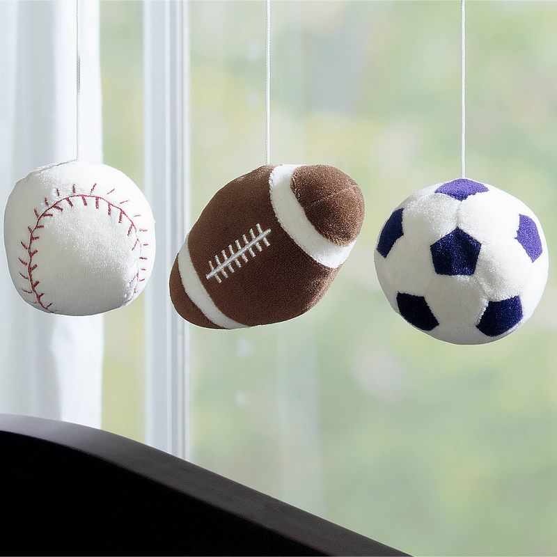 •Includes: 1 football, 1 soccer ball, 1 basketball, 1 baseball, music box and plastic mounting mobile parts