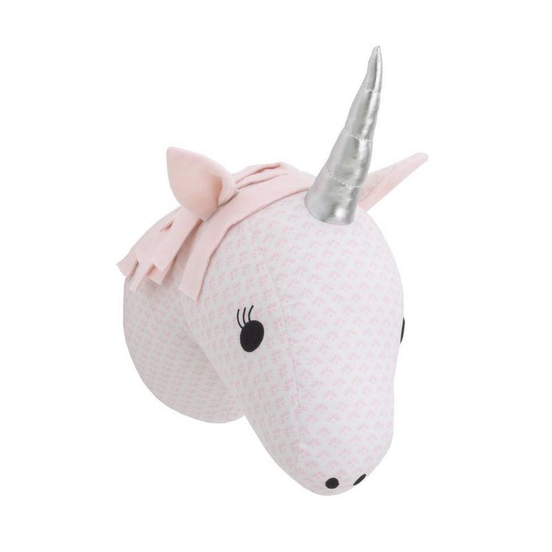 Add some adorable, animal-inspired whimsy to your nursery with the NoJo Unicorn Head Wall Décor! Covered in a sweet, pink and white patterned microfiber fabric with a soft poly fill, this cute unicorn head mounts easily with included ring. This sweet unicorn’s metallic glitter horn and friendly expression will delight your child and create a show-stopping nursery wall. Bold enough to be a nursery focal point, yet versatile enough to coordinate with many room designs, your new “fauxdermy” friend will be the highlight of the nursery!
