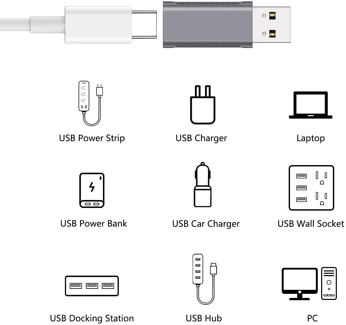 Compatible with a wall charger, docking station, power bank, car charger with USB-A port.