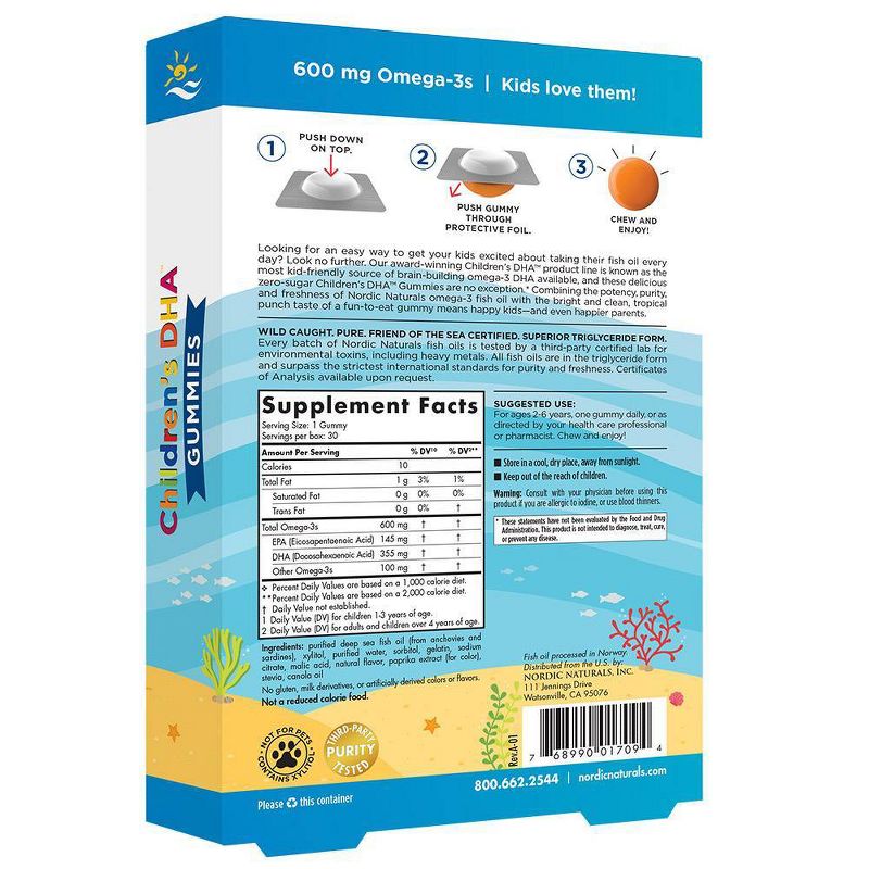 It can be hard for kids to get enough omega-3s, especially if they don't eat a lot of fish. But it's a safe bet that any child will try a yummy gummy. Children's DHA Gummies pack a substantial 600 mg daily serving of omega-3s into tasty, tropical punch flavor omega-3 gummies to support healthy brain development and learning.* Perfect for travel, these go-anywhere gummies come in individually sealed, shelf-stable packs for extra convenience. With fresh, pure, and effective omega-3 fish oil in a delicious, zero-sugar gummy, they're an easy way to get kids excited about taking their fish oil every day.