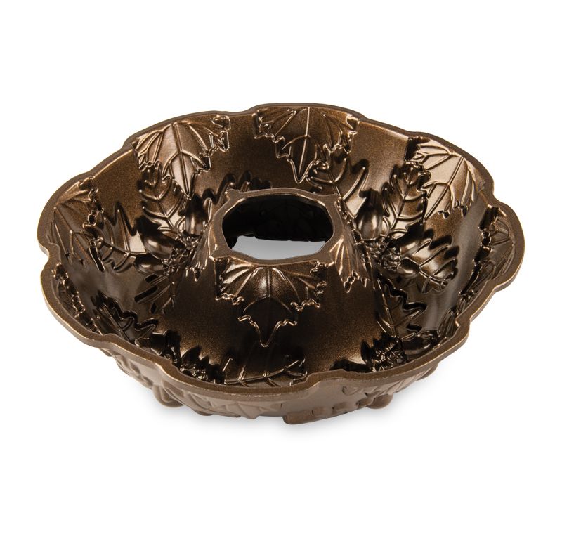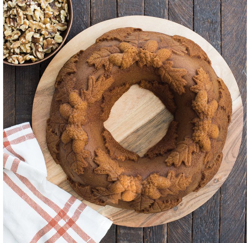 Classic and simple, a beautiful fall wreath makes a breakfast coffee cake or a fall flavored dessert something special. Our original Cast Aluminum Bakeware provides fine details and superior baking performance. Distinctive premium nonstick interiors allow for quick release and easy cleanup. Heat reflective silver platinum exteriors ensure uniform browning. 10 cup capacity.
