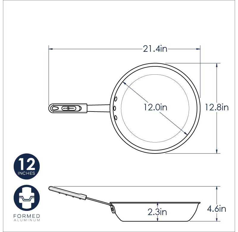 Extra heavyweight 3004 tempered aluminum alloy construction resists denting and warping. Triple riveted forged chrome steel handle with stay cool removable grips are safe for oven and broiler use. Teflon premium non-stick surfaces ensure easy release and clean up, plus tapered sidewalls allow for flip stirring foods. 12 inch diameter. Made in USA with imported handle.
