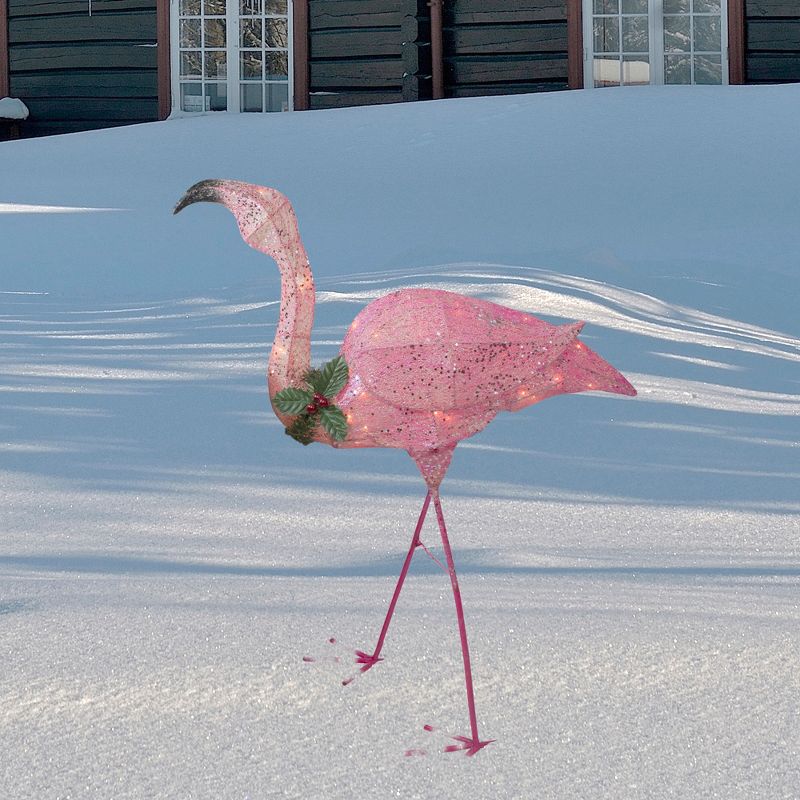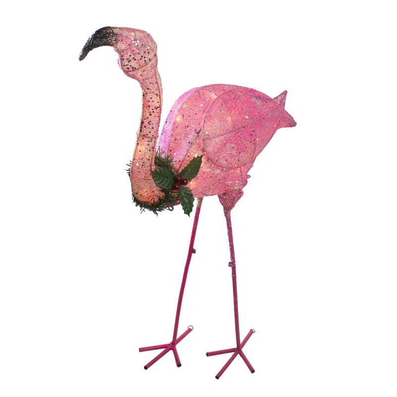 Bring summer to your yard this holiday with this adorable flamingo yard decoration. Perched on both legs with her pine and berry necklace on, this flamingo is ready to bring holiday cheer to you and your guests all winter long.