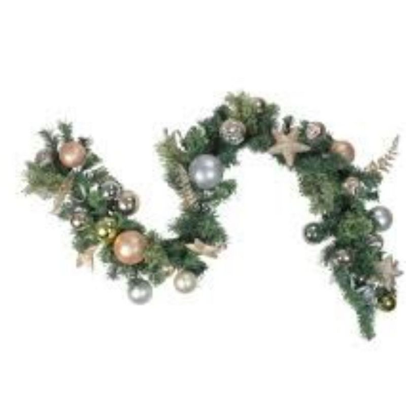 Deck the halls with strings of garland! Add this classy garland to your home decor this season. It displays vibrantly-hued ornaments with leaves and stars, creating a striking visual appeal. Perfect for hanging down railings, fireplace mantels, and more!