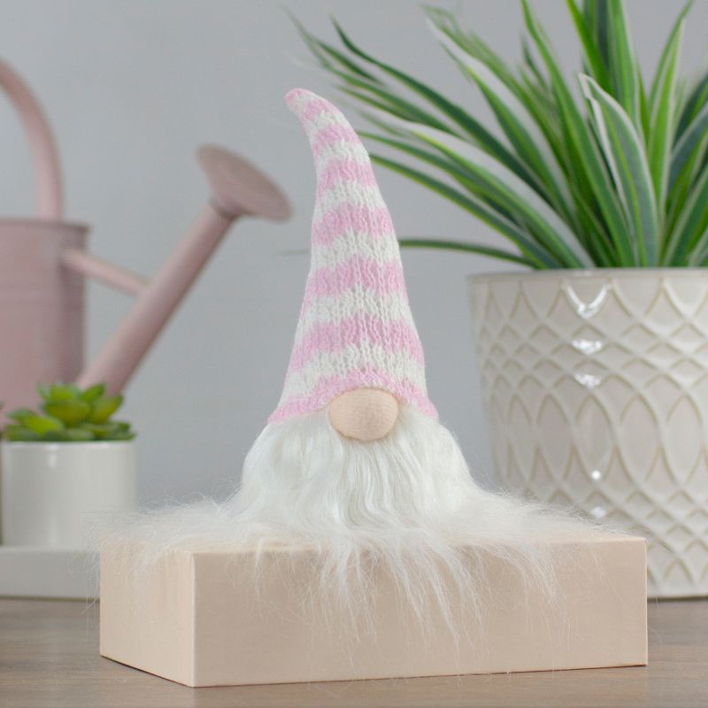 Gnomes are best known for guarding Earthly treasures and are perfect for protecting your goodies. This adorable gnome wears a soft pink and white striped knit hat, perfect for Spring and Easter! Add this guy to your gnome collection today!