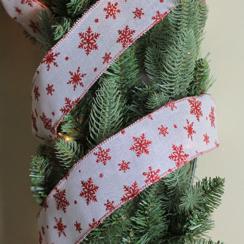 Features snowflakes with a red and white wire trim
