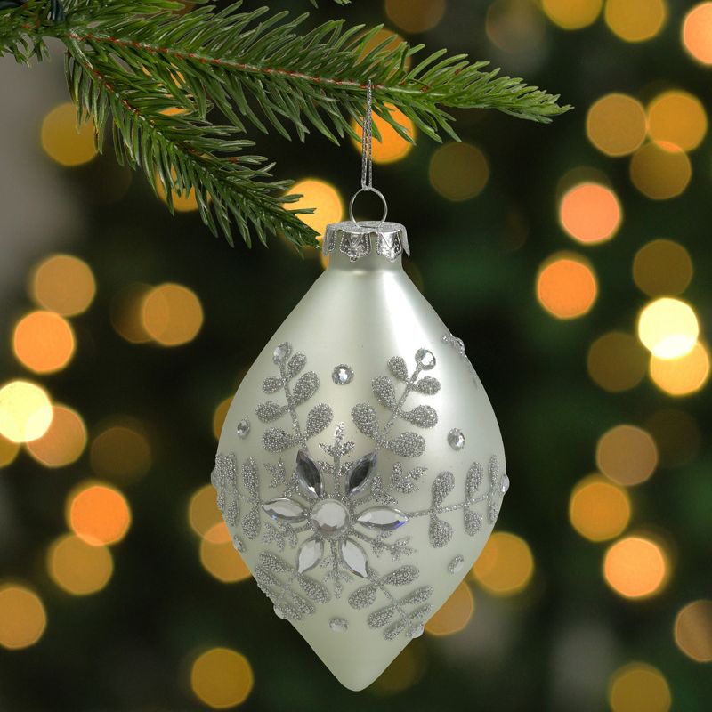 Add a touch of wintry elegance to your holiday decor with this finial ornament. It features a silver matte glass finish, decorated with embossed snowflakes and crystals throughout. It will look wonderful hanging from the holiday tree, mantle, or as an addition to a centerpiece.