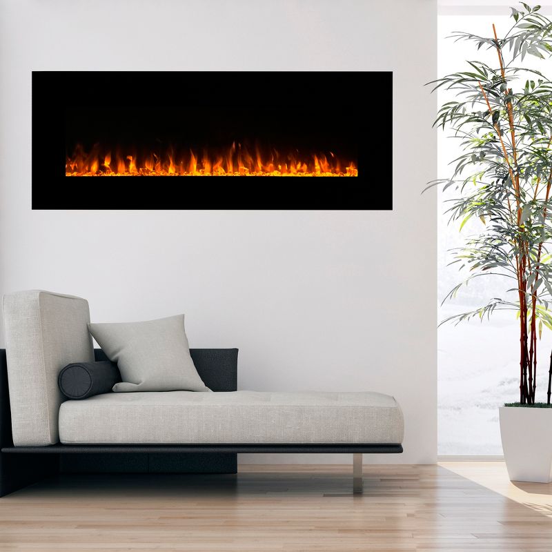 •TOP VENT DESIGN- This stylish black framed fireplace has a top vent design and a built-in temperature limiting device that is perfect for hanging on any wall with the included mounting bracket and hanger.
