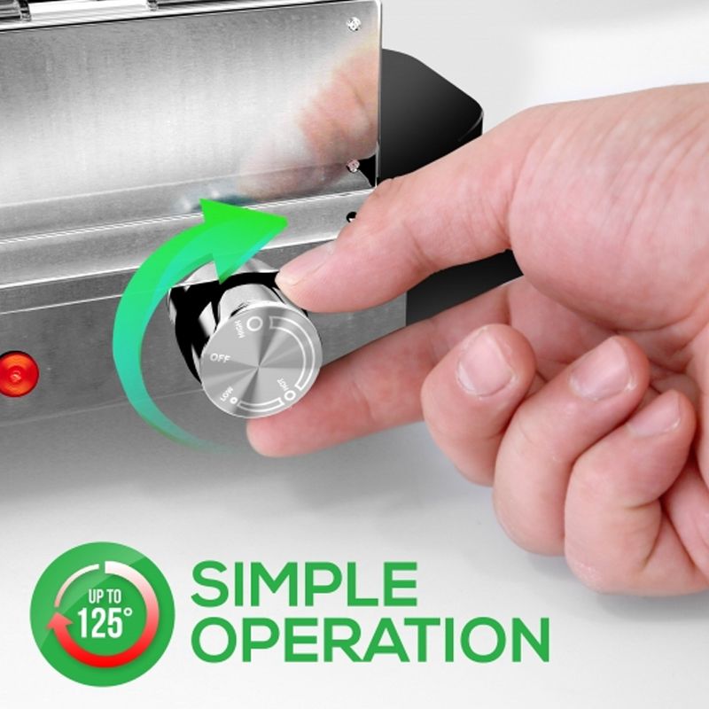 • Rotary temperature control prevents overcooking and scorching with a convenient indicator light
