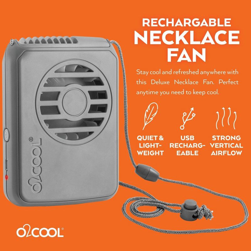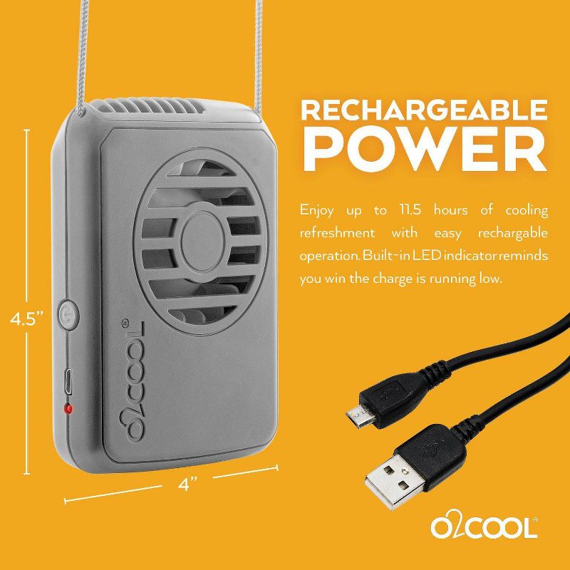 •NECKLACE FAN - NOW RECHARGEABLE! The best-selling hanging neck fan from O2COOL is now fully rechargeable, no batteries required! Easily charge it with the included micro USB charging cable. Light flashes while charging. Once charge is complete, light stops flashing.