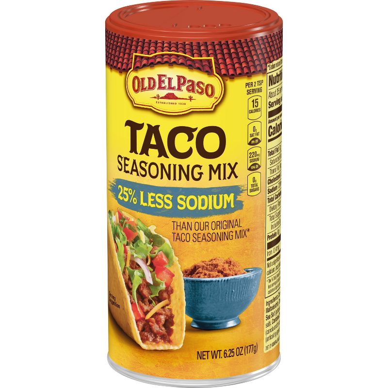25% Less Sodium than our Original taco seasoning mix, in a large shaker for those of you who love Taco Tuesday, Taco Thursday, and sometimes throw in a Taco Sunday! With this great-tasting seasoning, you can have tacos on the table in three easy steps. Plus, keep it on hand to spice up a variety of other dishes including soups, meats, and dips.