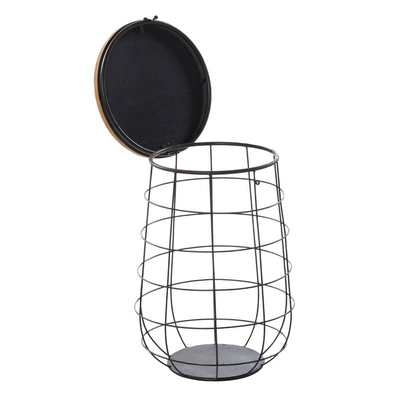 •This round metal basket with lid set highlights a cage-like base made of metal rods and a round wooden cover that closes via a latch lock