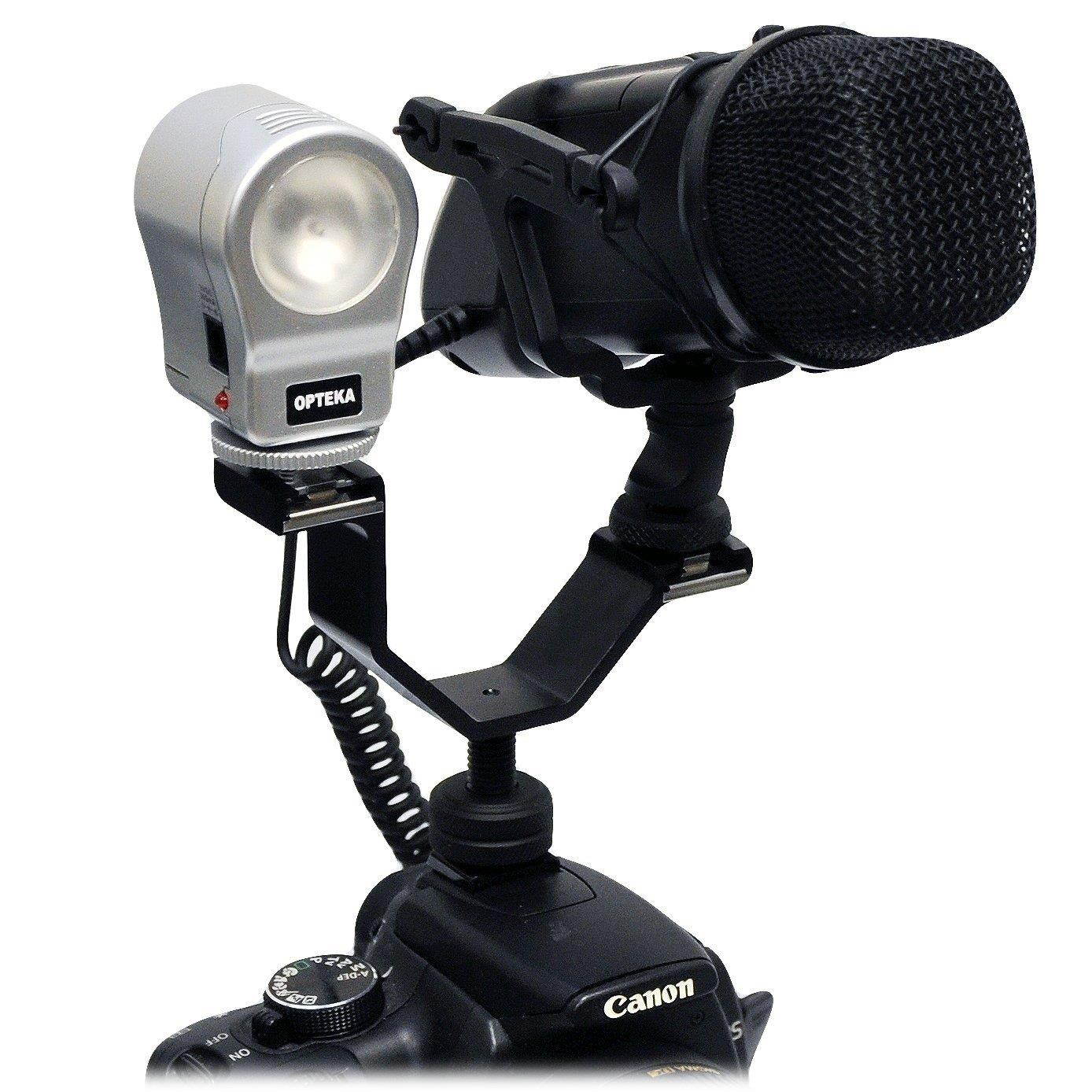 The Opteka VB-20 Heavy Duty Dual Cold Shoe Splitter Bracket mounts on to a camera or camcorders accessory shoe to double the mounting points for video lights, flashes, microphones, or monitors. Casted from thick cold steel, the VB-20 is strong enough to support heavier lights and microphones solid aluminum construction. The VB-20 fits standard hot/cold accessory shoes.