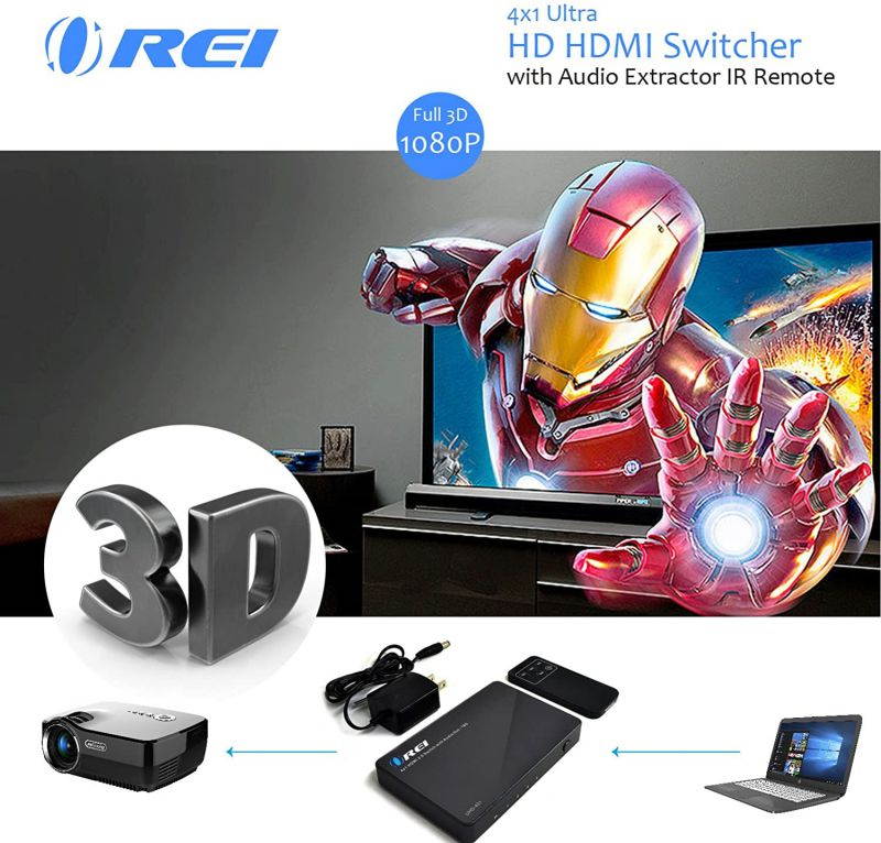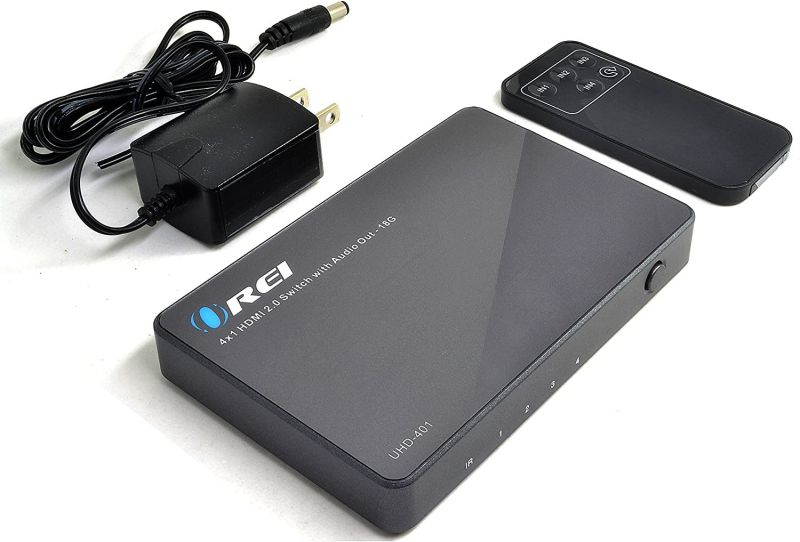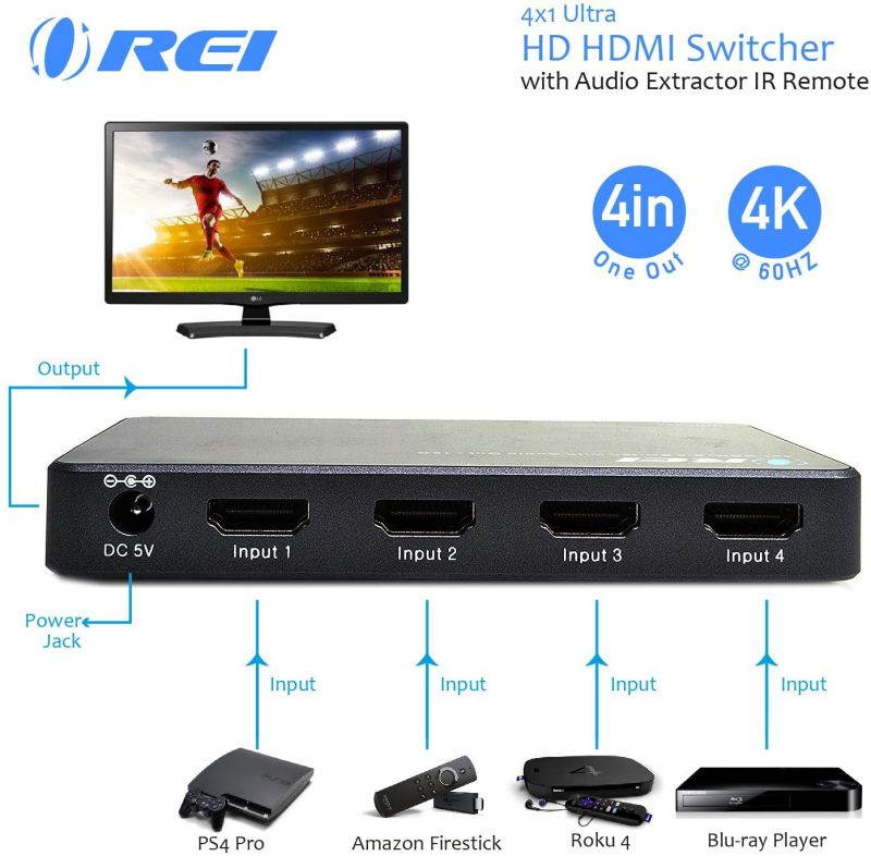 OREI 4x1 Supports Ultra HD HDMI 2. 0 Switch is a 4 port HDMI switcher for your Cable receiver, DirecTV, Gaming Console, Playstation, Nintendo Switch and Home Theater Setup. It supports 4 HDMI inputs and 1 HDMI output, allowing for HDMI 2. 0 and HDCP 2. 2, along with 4K Ultra HD and compatibility on all HDMI. Also has a 3. 5MM Audio Extract. 18G switcher w/ audio de-embedded, Specifications: - HDMI Compliance HDMI 2. 0B - HDCP 2. 2 and HDCP 1. 4 Compliant HDR -