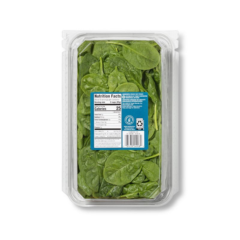 Whether you're whipping up a hearty stew or blending a refreshing smoothie, Organic Baby Spinach from Good & Gatherâ„¢ makes a versatile addition to your leafy vegetable drawer. Baby spinach is picked when it's young and tender, resulting in a milder taste that's perfectly suited for a wide range of recipes. Thoroughly washed and ready to enjoy, you can use it as a base for a salad, perhaps with arugula, cucumbers, red onions, feta cheese and balsamic vinaigrette for a Mediterranean delight, a topper for a vegetarian grilled cheese sandwich, alongside other greens in a veggie omelette or in your favorite stew with other vegetables and a quinoa or pasta base. An excellent source of folate and vitamins A and C, the whole family can benefit from the satisfying nutrients and delicious taste of organic baby spinach.