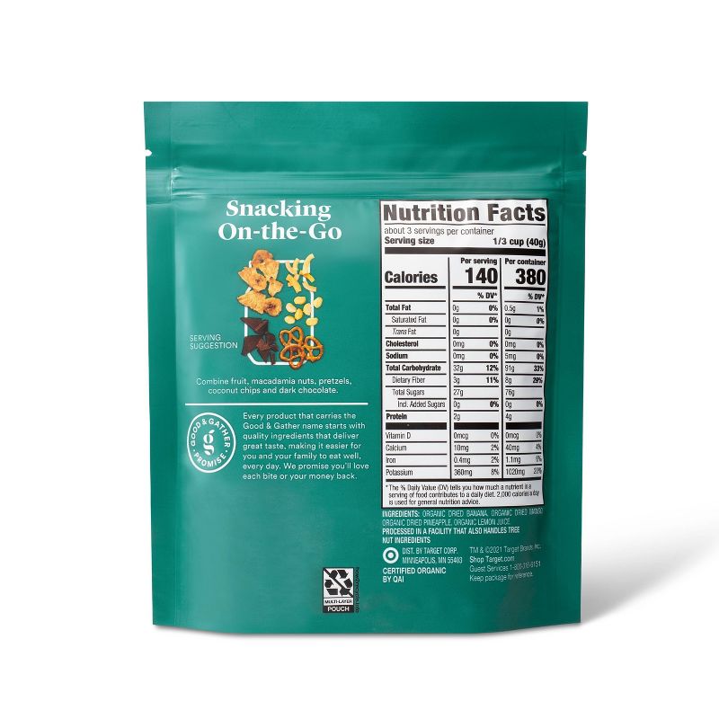 Take your sweet snacking game to the next level with this Organic Dried Unsweetened Pineapple, Mango and Banana Blend from Good & Gather™. The sweet taste of the banana and mango with pineapple is the combination you've been looking for, and with no added sugars or artificial flavors, it’s a choice you and your whole family can feel great about. This USDA organic dried fruit blend also has no GMOs or added sulfites. Create your own trail mix, add a sweet touch to packed lunches or bring along a tasty on-the-road snack on a busy day.
