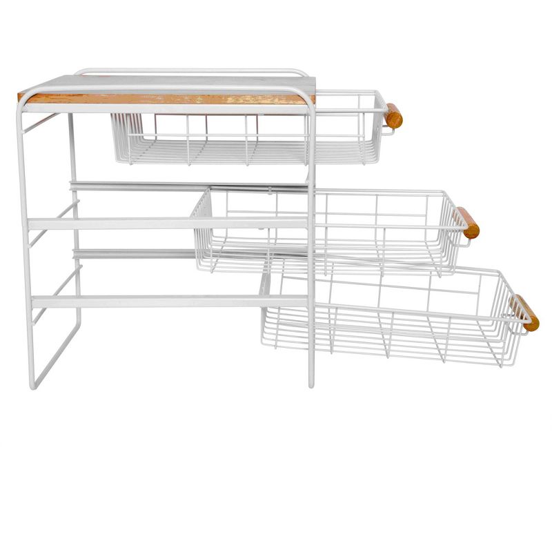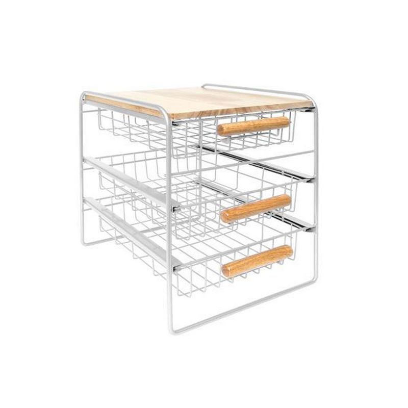 This nifty little storage rack unit fits on most kitchen, bathroom, or laundry room countertops, making it the perfect place to stash everything from kitchen utensils to rags to shampoo and more. Its 3 metal drawers and handsome wood top keep everything organized, and it folds flat for storage when you don't need it.