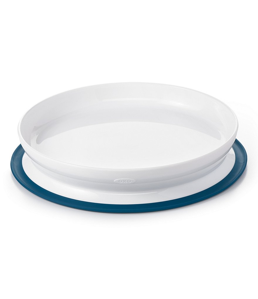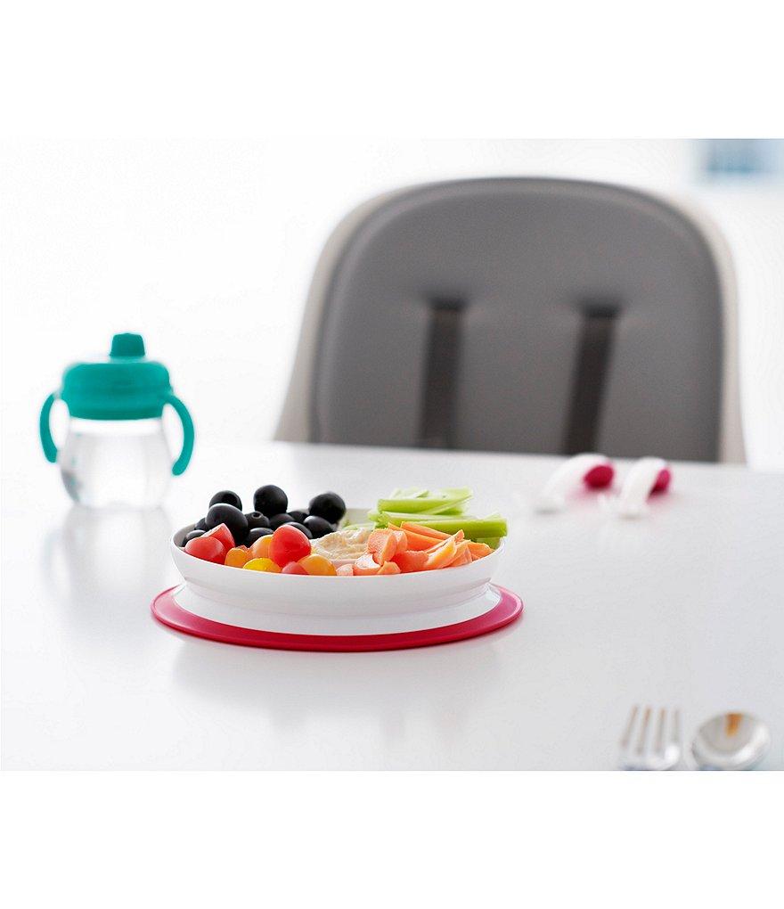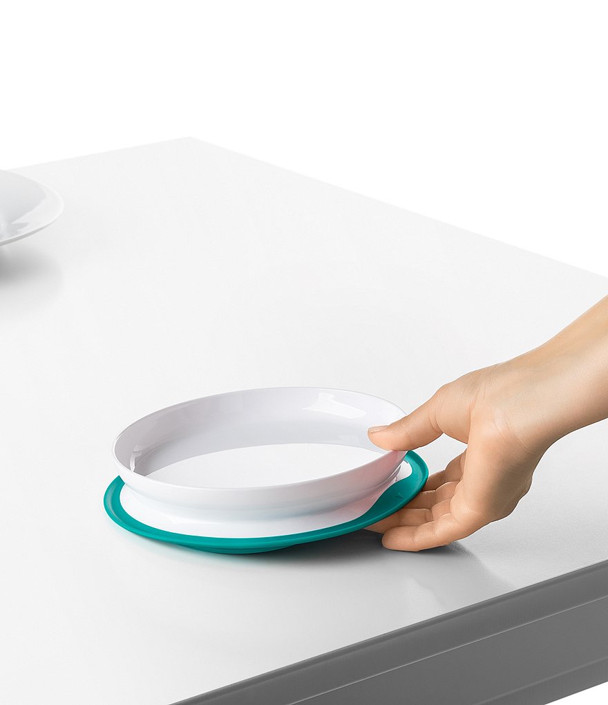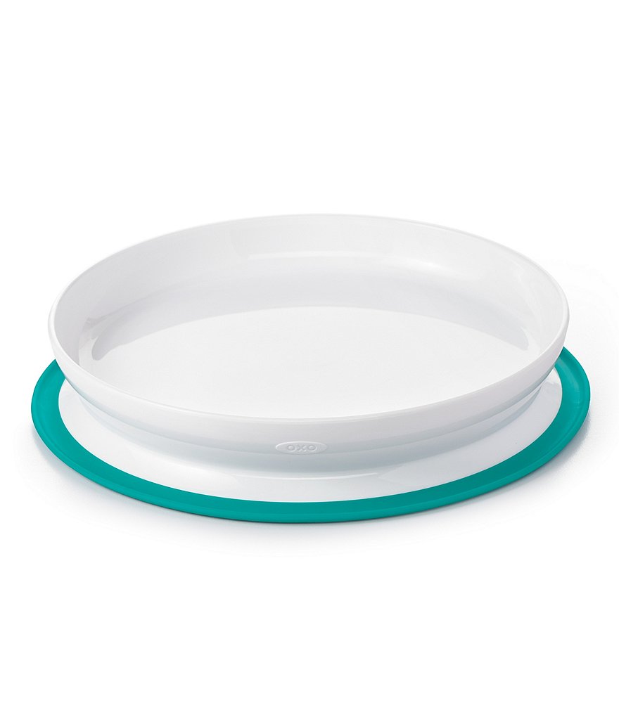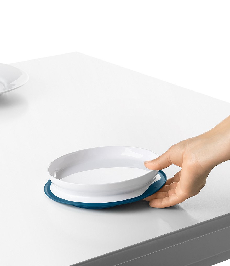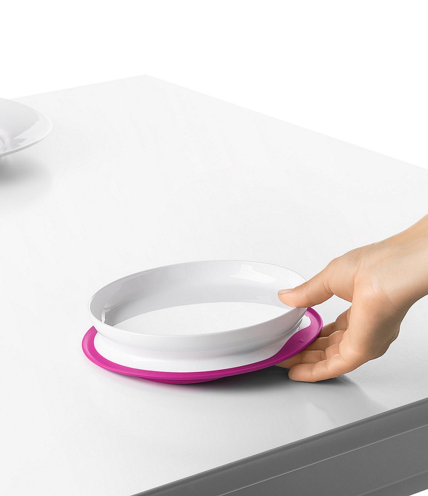 - The Plate features a silicone base that sticks surfaces until mealtime is over, preventing sliding, slipping and tipping.