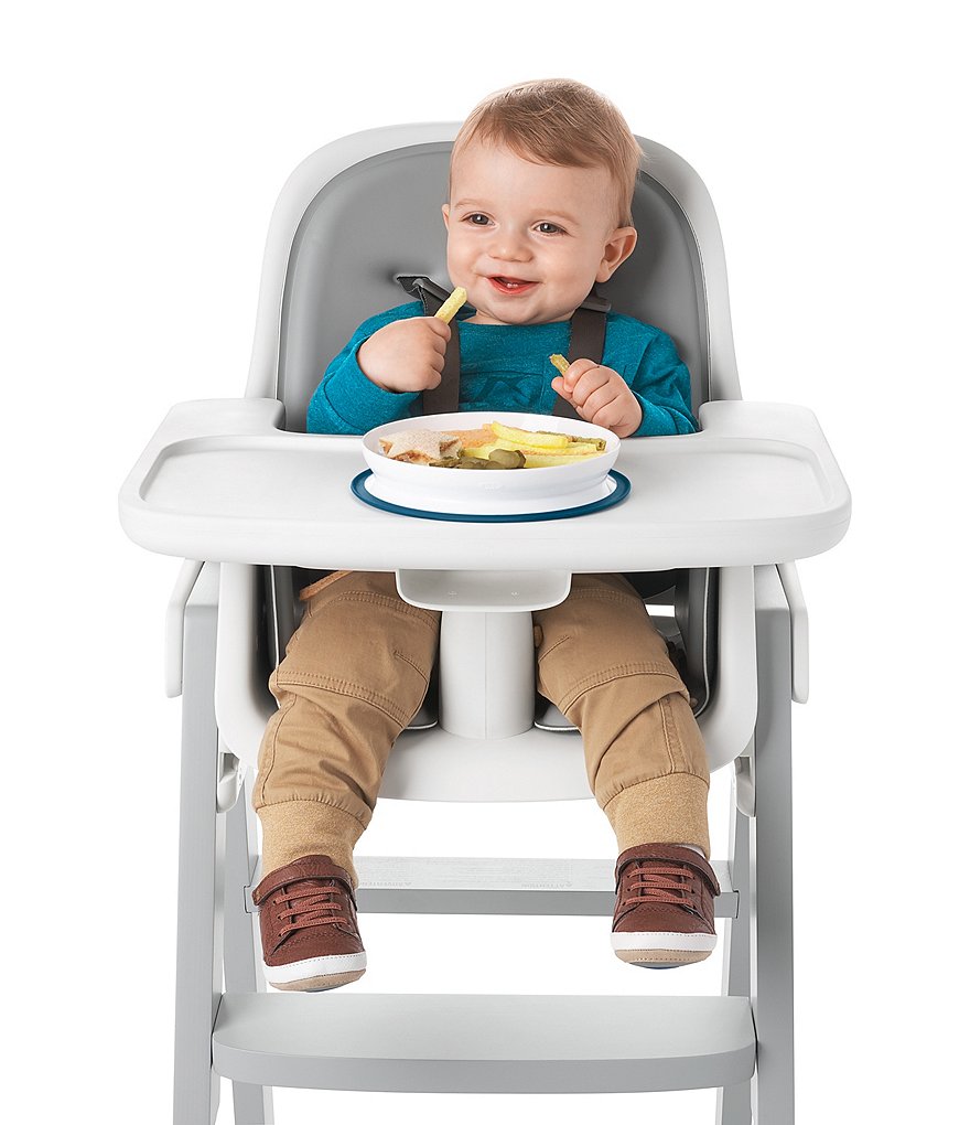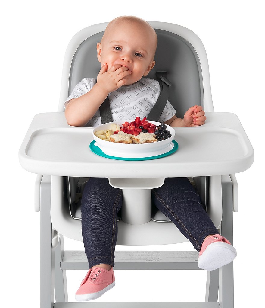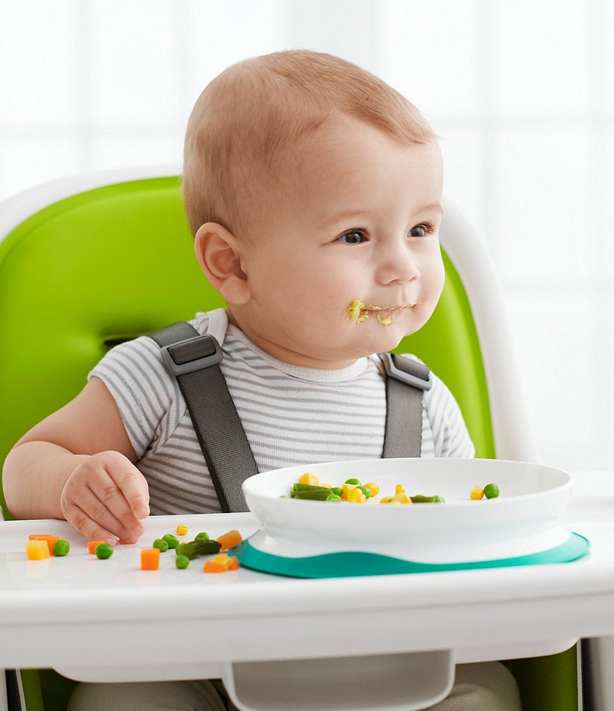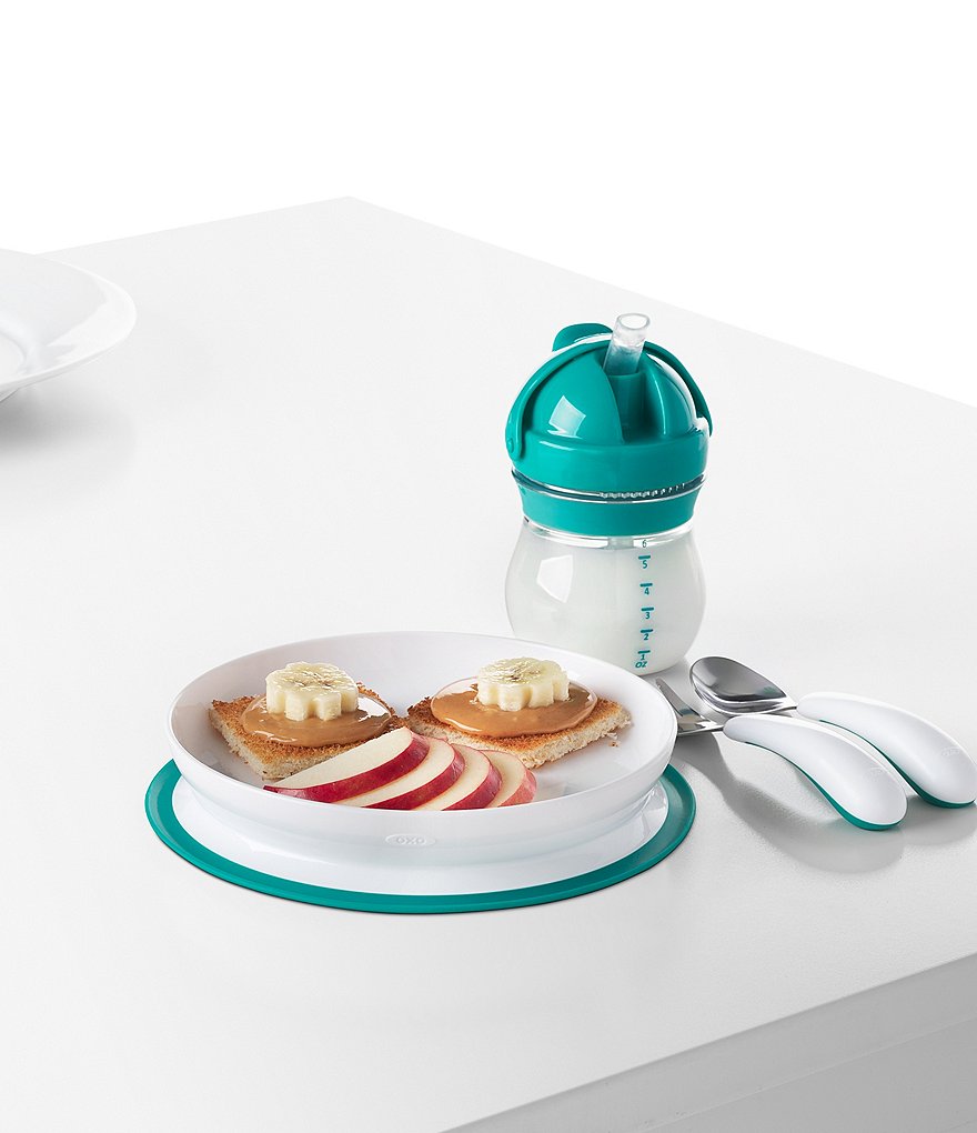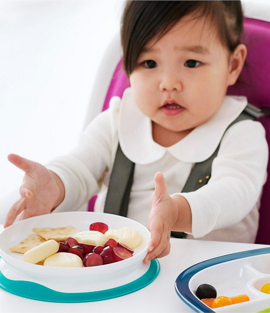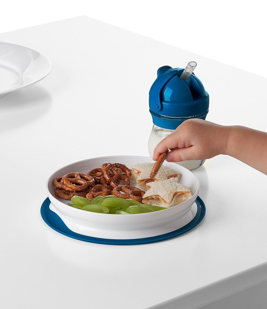 - The Plate features a silicone base that sticks surfaces until mealtime is over, preventing sliding, slipping and tipping.