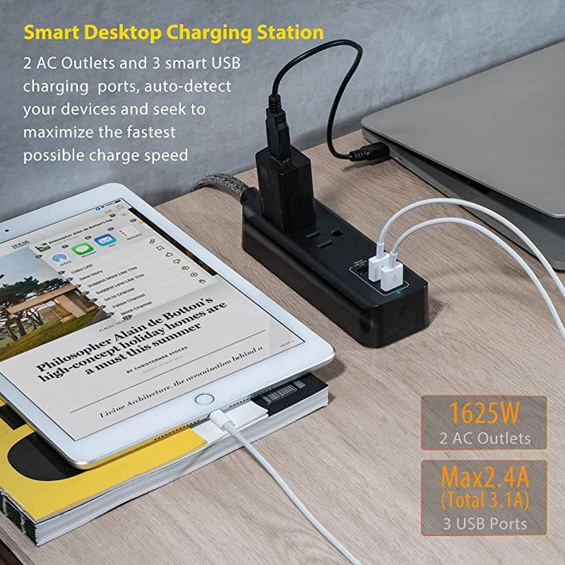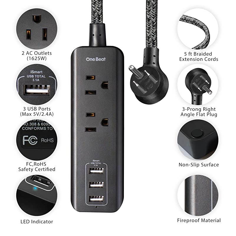 4A (total output: 3.1A / 15.5W ), and helps to eliminate the need for using multiple chargers. The quick USB charging station with smart charging technology automatically adjusts the current for devices like iPhone, iPad, laptop, iWatch or Bluetooth headphones for optimizing charging speed. *****5ft Braided Extension Cord with Flat Flag- The 5ft-long extension cord is very thick and has better current carrying capacity (13A). Flat plug eliminates bulky awkward cords from cluttering indoor decor and minimizes tripping. 45-degree angled design doesnt block the bottom receptacle of your duplex wall outlet*****Safety System- Powe