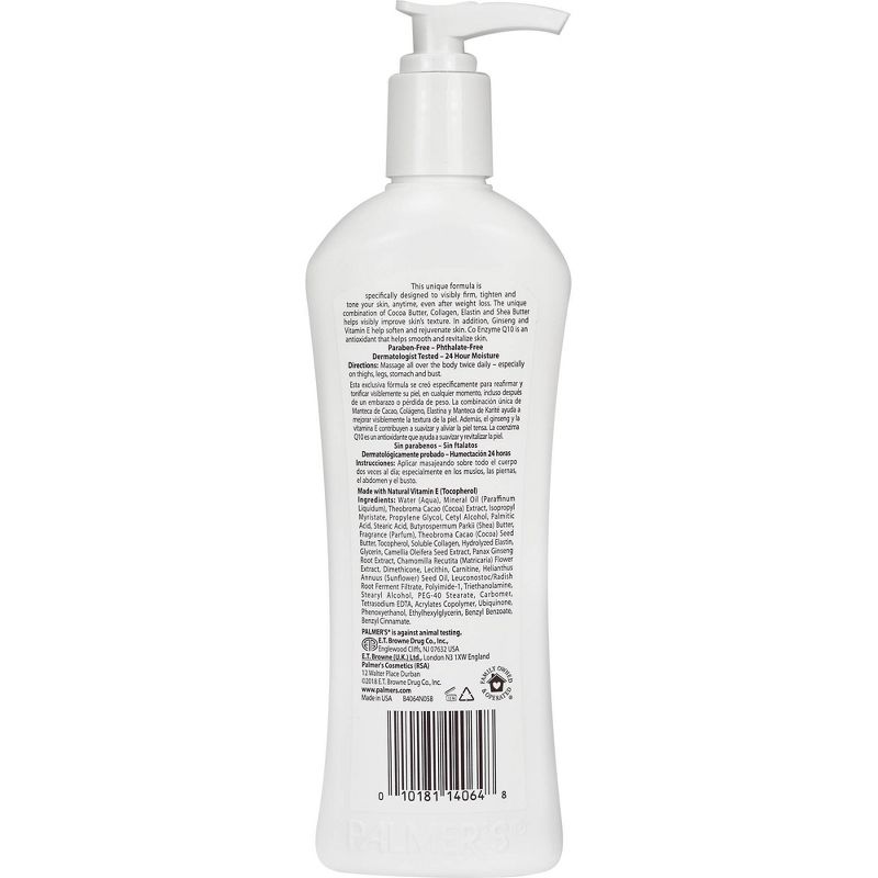 Palmer's Cocoa Butter Formula Firming Butter, a unique formula that is specifically designed to help visibly restore your body, especially after pregnancy or weight loss. The unique combination of Cocoa Butter, Collagen, Elastin and Shea Butter firms and tones while helping to visibly improve skin's texture. In addition, Ginseng and Vitamin E help soften and relieve stressed skin. Co Enzyme Q10 is an antioxidant that helps smooth and revitalize skin.