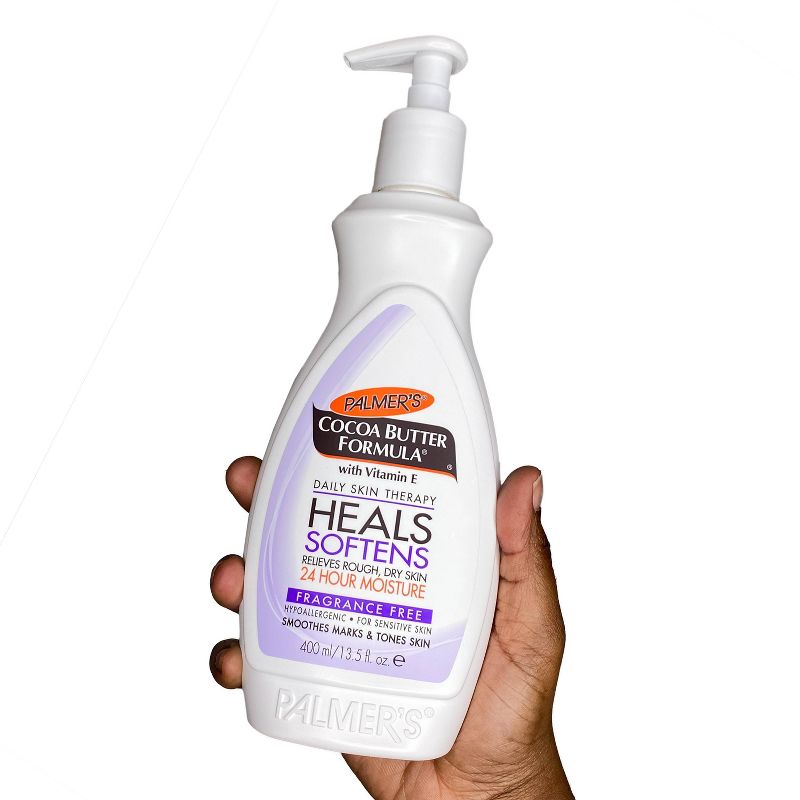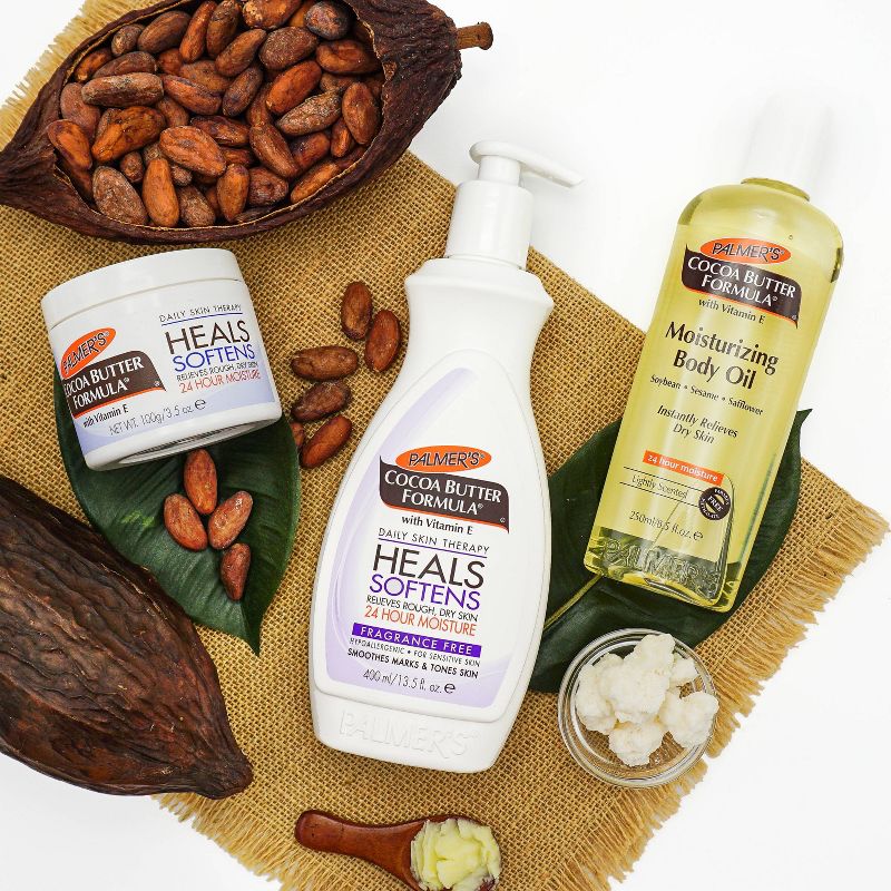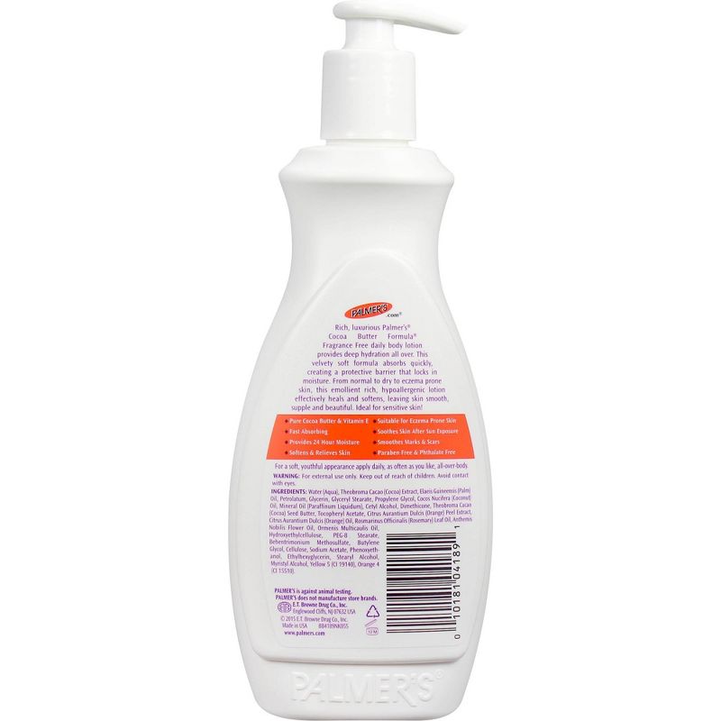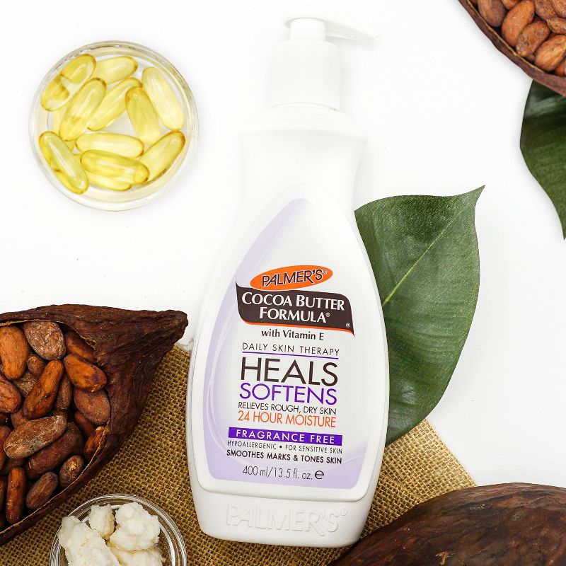 Rich, luxurious Palmer's Cocoa Butter Formula Daily Skin Therapy body lotion with Vitamin E provides deep hydration all over. This velvety soft and fragrance-free formula scent absorbs quickly, creating a protective barrier that locks in moisture all day long, up to 24 hours. Made with Cocoa Butter to naturally moisturize, & Vitamin E to help improve the appearance of scars, stretch marks & skin imperfections, this emollient rich lotion gives your skin a more even & toned appearance. From normal skin to dry skin to eczema prone skin, this deep hydrating all-over-body lotion effectively heals and softens, leaving your skin smooth, supple and beautiful. Also serves as an excellent after tanning butter.