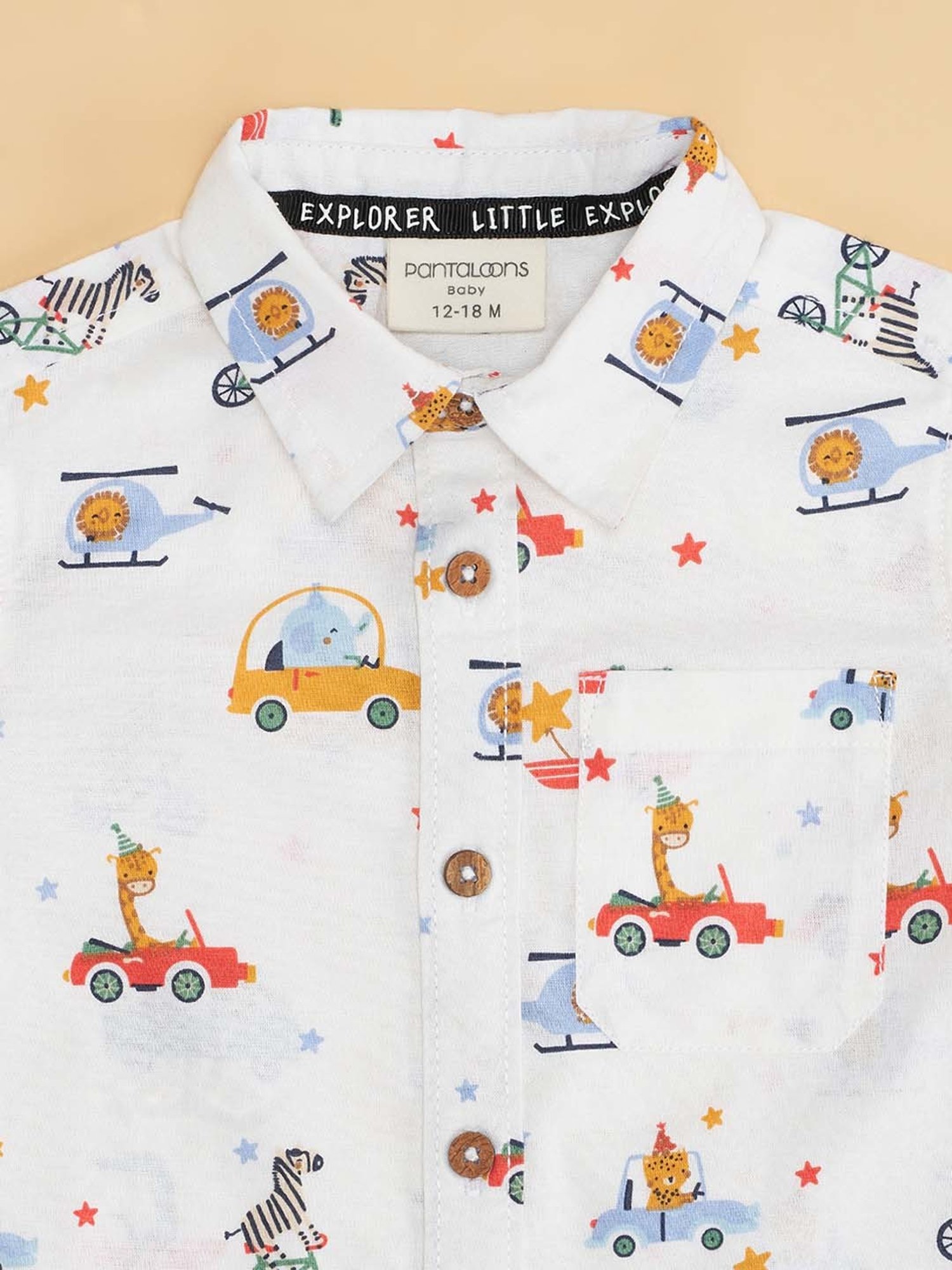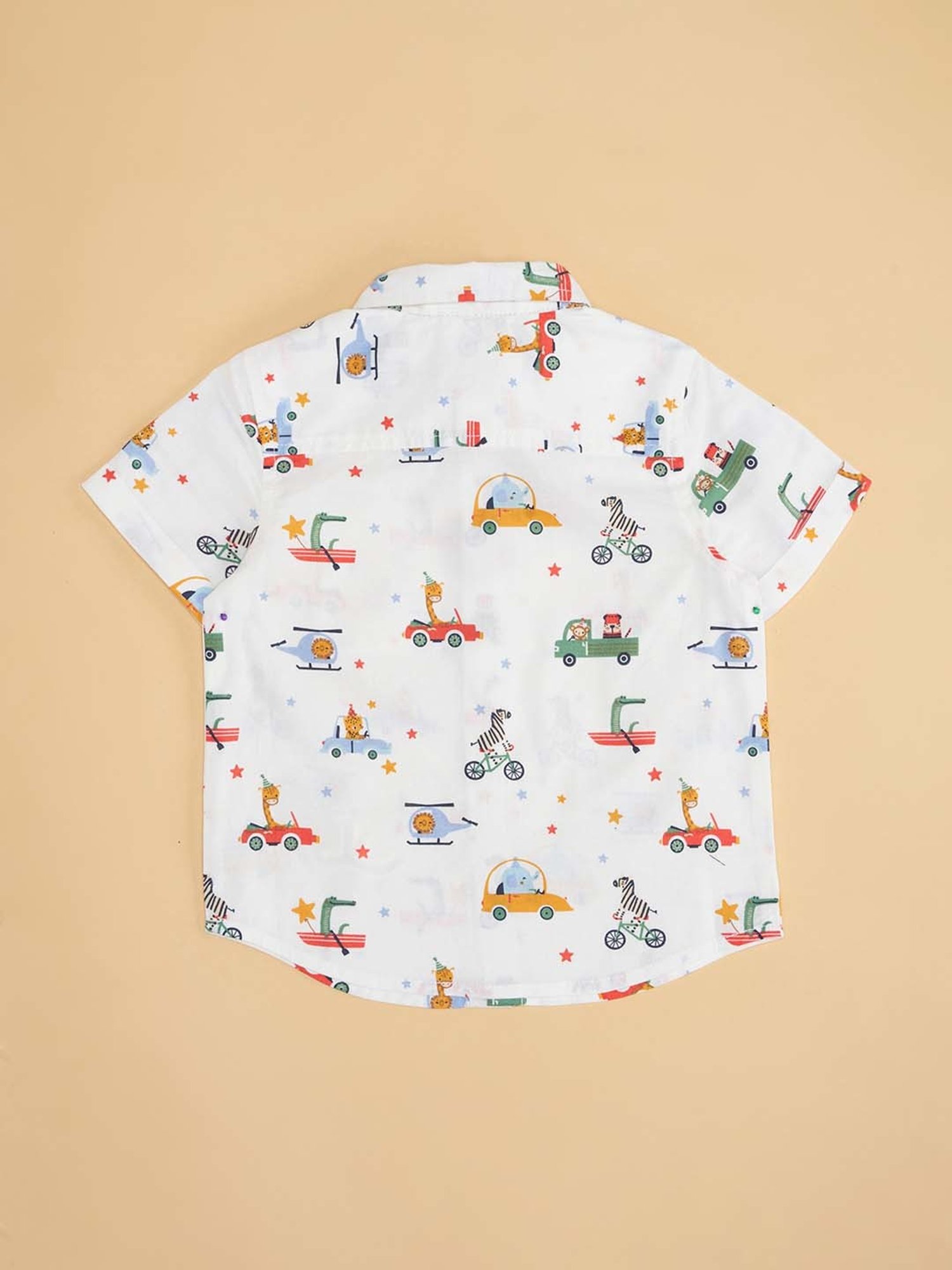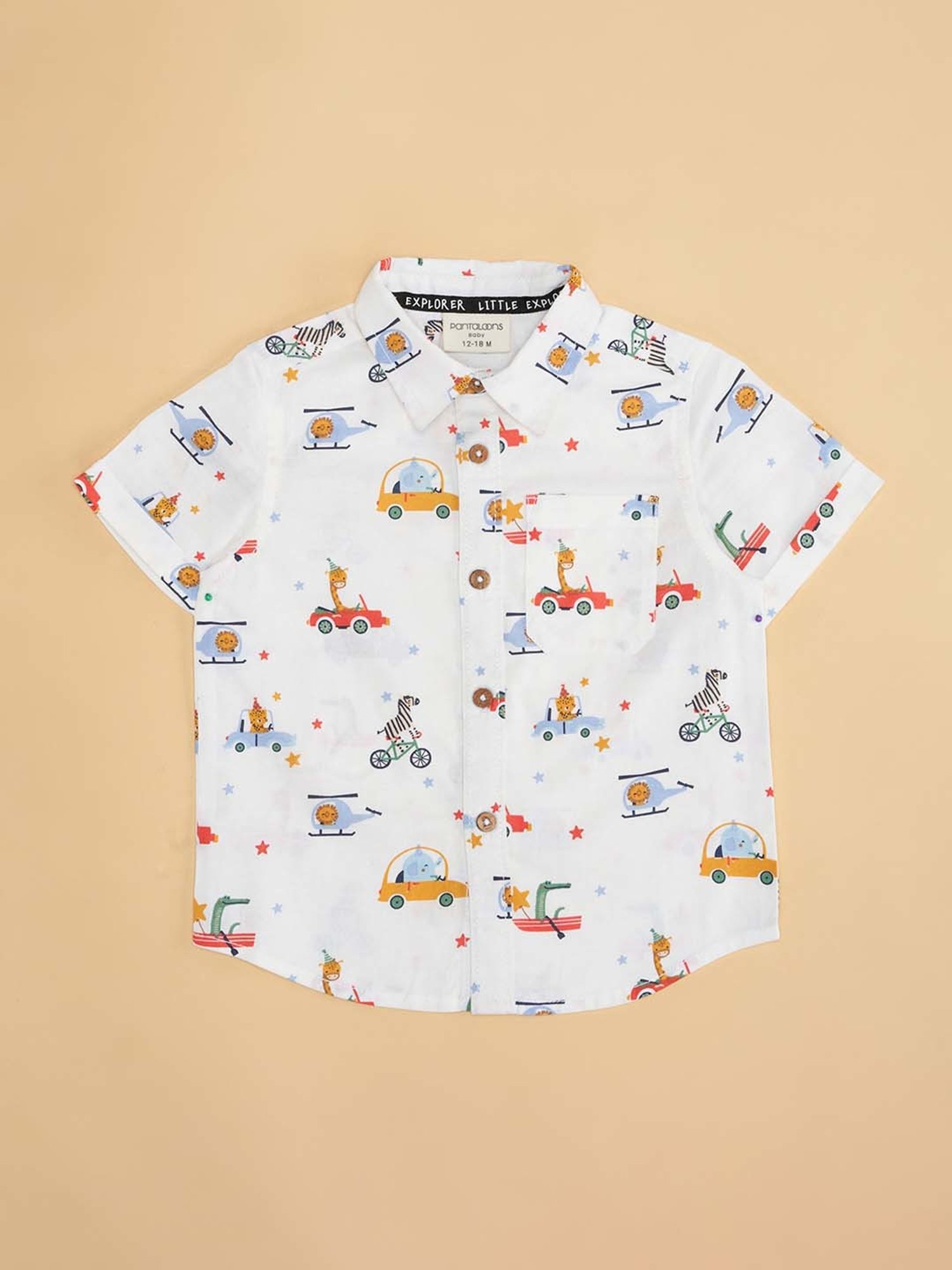 Give your little kid's wardrobe a stylish lift with this white shirt from Pantaloons Baby. Crafted with care using premium quality cotton fabric, it will be very soft to the skin. The collared neckline elevates its design. Flaunting half sleeves, it will surely keep your kid updated with the latest trend. The printed pattern makes it a captivating choice.