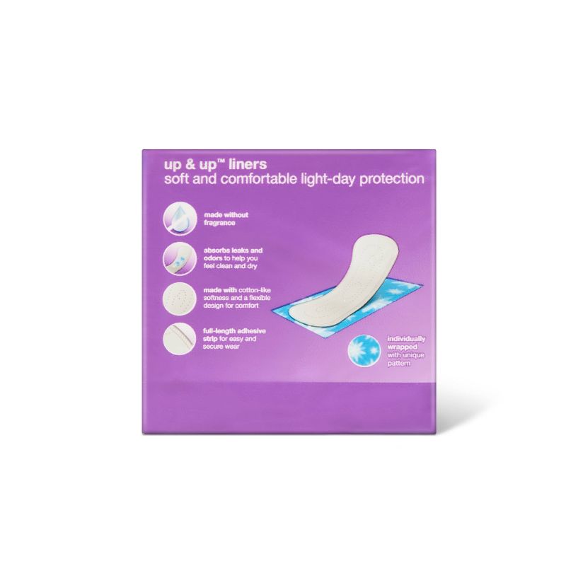 Make sure you're always prepared by having these Regular Absorbency Panty Liners from up & up™ close at hand to take on any day while having the protection you need. They provide you with light protection during the day, along with having a thin and contoured shape for comfortable wear. The adhesive band holds the liner securely in place as you move while having a moisture-proof barrier that protects against leaks. These unscented thin panty liners help you feel fresh and dry as you take on any day.