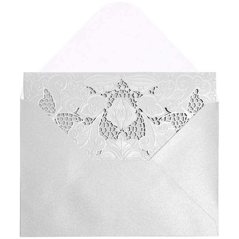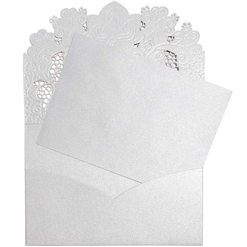 • WEDDING INVITATION CARDS: Includes a pack of 24 luxurious wedding invitation covers, inserts and envelopes. You'll be impressed by how luxurious these invitation cards feel! The covers are adorned with silver foil and are laser cut, featuring a lace-like floral theme. Both the envelopes and covers have a classy shimmer that screams elegance