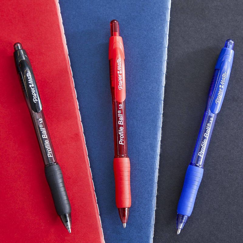 Make smooth, crisp lines with Paper Mate Profile ballpoint pens. These retractable pens now come in a 1.0mm tip, so you can write powerful lines that stand out on the page. Profile pens also include a soft grip for comfortable writing during any writing task and the bright ink create a powerful writing experience.